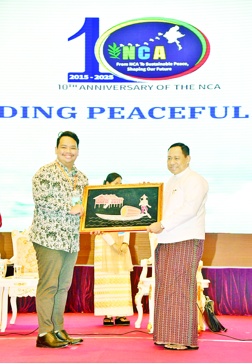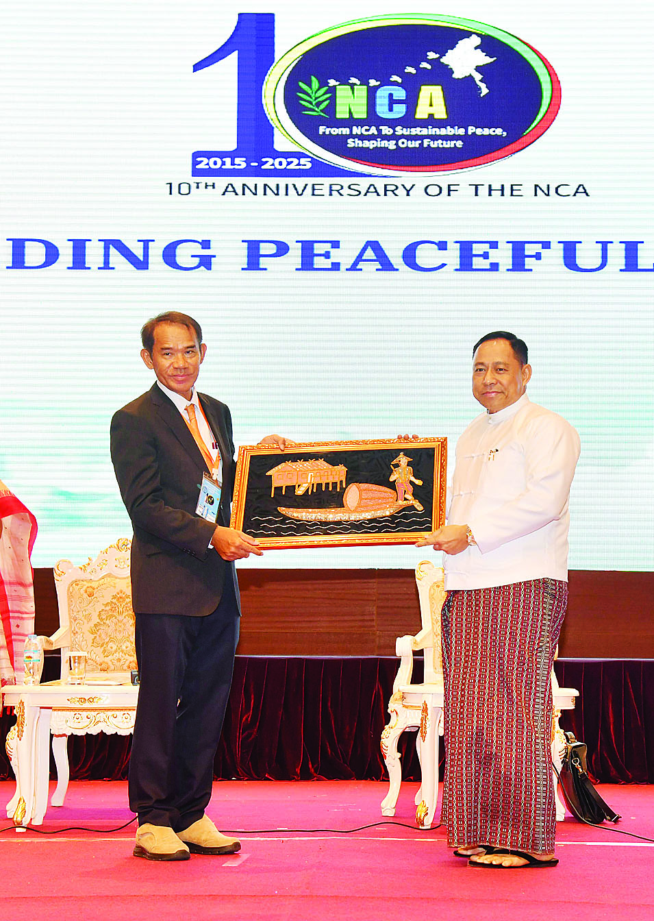 တစ်နိုင်ငံလုံးပစ်ခတ်တိုက်ခိုက်မှုရပ်စဲရေးသဘောတူစာချုပ် (NCA)(၁၀)နှစ်ပြည့်နှစ်ပတ်လည်နေ့အထိမ်းအမှတ်အစီအစဉ်အဖြစ် “ငြိမ်းချမ်းသော မြန်မာ့အနာဂတ်တည်ဆောက်ခြင်း” အလုပ်ရုံဆွေးနွေးပွဲကို နေပြည်တော်ရှိ မြန်မာအပြည်ပြည်ဆိုင်ရာကွန်ဗင်းရှင်းဗဟိုဌာန(၁)ကျောက်စိမ်းခန်းမ၌ ဆက်လက်ကျင်းပသည်။