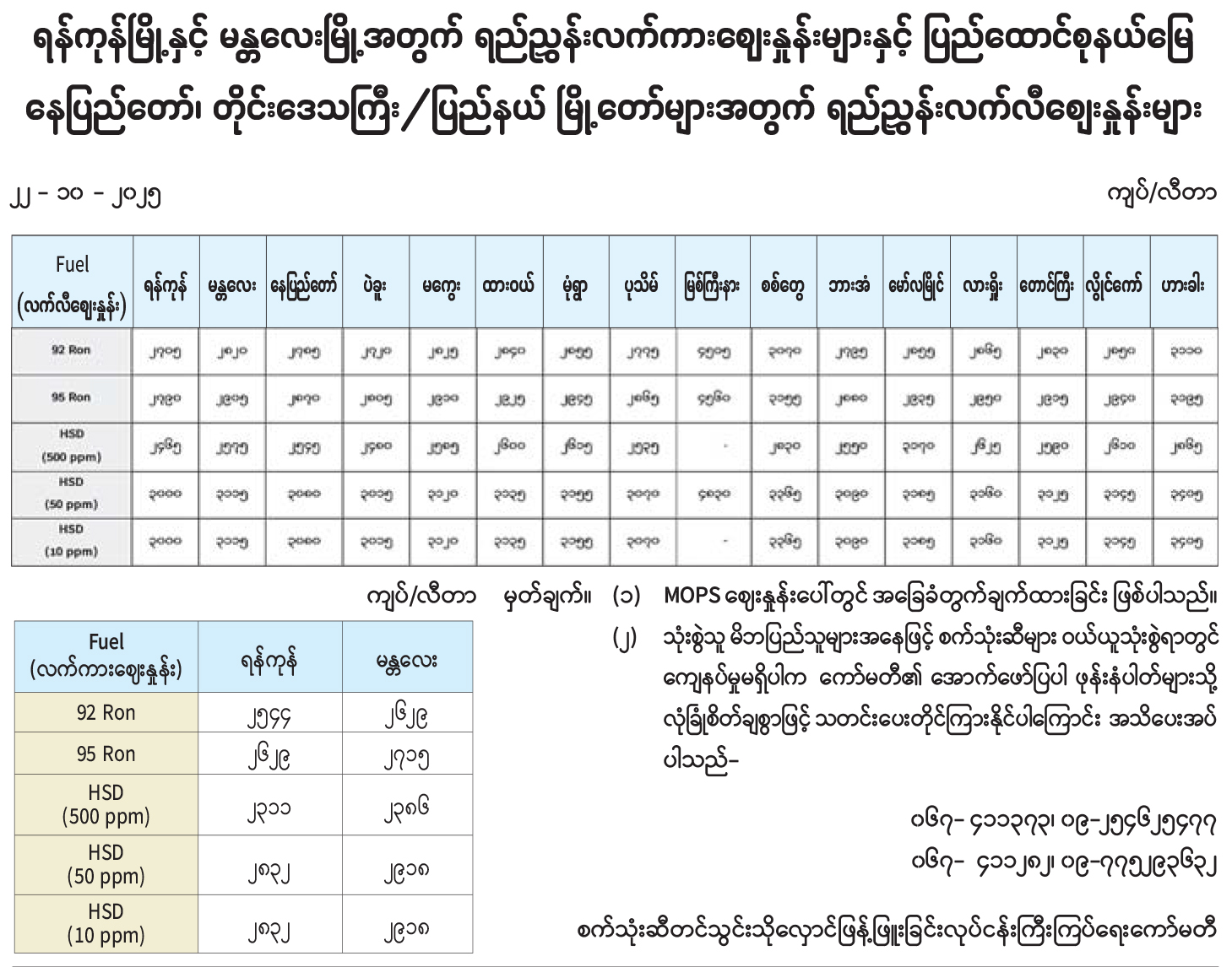 ရန်ကုန်မြို့နှင့် မန္တလေးမြို့အတွက် ရည်ညွှန်းလက်ကားဈေးနှုန်းများနှင့် ပြည်ထောင်စုနယ်မြေနေပြည်တော်၊ တိုင်းဒေသကြီး/ပြည်နယ် မြို့တော်များအတွက် ရည်ညွှန်းလက်လီစျေးနှုန်းများ 10/22/2025