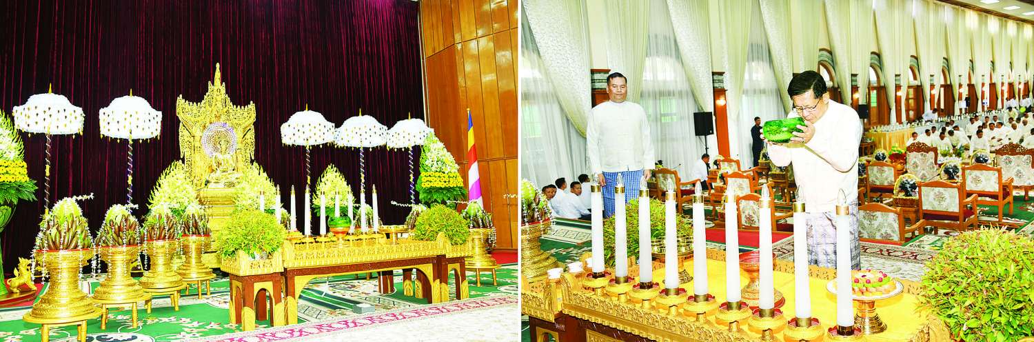 ဦးစွာ နိုင်ငံတော်လုံခြုံရေးနှင့်အေးချမ်းသာယာရေးကော်မရှင်ဥက္ကဋ္ဌ တပ်မတော်ကာကွယ်ရေးဦးစီးချုပ်နှင့်ဇနီး၊ ဧည့်ပရိသတ်များသည် ဘုန်းတော်ကြီးကျောင်းအသီးသီးသို့ လှူဒါန်းရန် ခင်းကျင်းပြင်ဆင်ထားသည့် ကထိန်လျာသင်္ကန်း၊ လှူဖွယ်ပစ္စည်းများနှင့် ပဒေသာပင်များအား လှည့်လည်ကြည့်ရှုကြသည်။ ထို့နောက် နိုင်ငံတော်လုံခြုံရေးနှင့် အေးချမ်းသာယာရေးကော်မရှင်ဥက္ကဋ္ဌ တပ်မတော်ကာကွယ်ရေးဦးစီးချုပ်သည် အနော်ရထာခန်းမအတွင်းရှိ ဗုဒ္ဓရုပ်ပွားတော်မြတ်အား ဖူးမြော်ကြည်ညို၍ မြသပိတ်ဆွမ်းတော်နှင့် ပန်း၊ သောက်တော်ရေချမ်း၊ ဆီမီး၊ သစ်သီးတို့ကို ဆက်ကပ်လှူဒါန်းသည်။