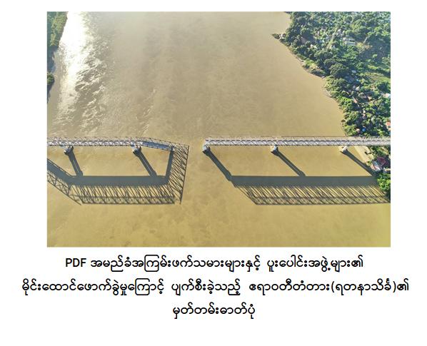 ဧရာဝတီတံတား(ရတနာသိင်္ခ)သည် တံတားအရှည် ပေ ၂၄၈၀ (သံကူကွန်ကရစ်တံတား)၊ တံတားအကျယ် ၂၅ ပေ၊ လူသွားလမ်း ဘယ်/ညာသုံးပေရှိပြီး တံတားဆောက်လုပ်ရေးအထူးအဖွဲ့-၁၄ မှ ၂၀၁၀ ပြည့်နှစ် ဧပြီလ ၁၆ ရက်နေ့တွင် စီမံကိန်းစတင်ကာ ၂၀၁၃ ခုနှစ် ဇူလိုင်လ ၂၄ ရက်နေ့တွင် ဆောက်လုပ်ပြီးစီး၍ ဖွင့်လှစ်ခဲ့ကြောင်းသိရသည်။ ယခုအခါ PDF အမည်ခံအကြမ်းဖက်သမားများနှင့် ပူးပေါင်းအဖွဲ့များက ဒေသတွင်းကောင်းစားရေးဟုသုံးနှုန်း၍ အမှန်တကယ်တွင် ပြည်သူလူထု၏လူမှုစီးပွားဘဝများ၊ လူအခွင့်အရေးများ များစွာဆုံးရှုံးအောင်လုပ်ဆောင်နေကြသည့်အပေါ် ဒေသခံပြည်သူများက သိရှိနားလည်သဘောပေါက်လာကြပြီဖြစ်ပြီး ယခုကဲ့သို့ စစ်ရေးနှင့်သက်ဆိုင်ခြင်းမရှိသည့် ဧရာဝတီတံတား(ရတနာသိင်္ခ)အား မိုင်းထောင်ဖောက်ခွဲဖျက်ဆီးခဲ့မှုအပေါ် ရွံရှာမုန်းတီးစွာ ကန့်ကွက်ရှုတ်ချလျက်ရှိကြောင်းနှင့် သက်ဆိုင်ရာတာဝန်ရှိသူများအနေဖြင့်လည်း အဆိုပါတံတားအား ပြန်လည်ပြင်ဆင်ခြင်းလုပ်ငန်းများကို အမြန်ဆုံးဆောင်ရွက်ပေးသွားမည်ဖြစ်ကြောင်း သတင်းရရှိသည်။