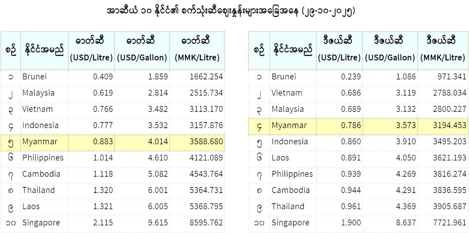 ယင်းသို့ ဆောင်ရွက်နေသည့်ကာလများအတွင်း စက်သုံးဆီများကို ပြည်ပမှဝယ်ယူတင်သွင်း အသုံးပြုရာ၌ အများပြည်သူသို့ သက်သာသောဈေးနှုန်းဖြင့် ဖြန့်ဖြူးနိုင်ရန် နိုင်ငံတော်မှရာခိုင်နှုန်းတစ်ခု စိုက်ထုတ်ကျခံဆောင်ရွက် ပေးလျက်ရှိသည့်အတွက် မြန်မာနိုင်ငံတွင်ရောင်းချလျက်ရှိသည့် စက်သုံးဆီဈေးနှုန်းများသည် ဒေသတွင်းအာဆီယံ နိုင်ငံများနှင့်နှိုင်းယှဉ်ပါက အထိုက်အလျောက်သက်သာမှု ရှိသည်ကို တွေ့မြင်နိုင်သည်။