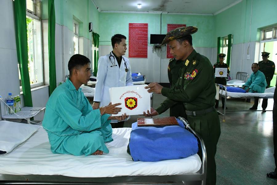 ရှမ်းပြည်နယ်(တောင်ပိုင်း) အောင်ပန်းမြို့နှင့်ခိုလမ်မြို့တို့ရှိ တပ်မတော်ဆေးရုံများ၊ ရှမ်းပြည်နယ်(အရှေ့ပိုင်း) ကျိုင်းတုံမြို့ရှိတပ်မတော်ဆေးရုံ၊ တနင်္သာရီတိုင်းဒေသကြီး မြိတ်မြို့ရှိ တပ်မတော်ဆေးရုံ၊ ရန်ကုန်တိုင်းဒေသကြီး မင်္ဂလာဒုံမြို့နယ်ရှိ တပ်မတော်အရိုးရောဂါ အထူးကုဆေးရုံကြီး(ခုတင်-၅၀၀)နှင့် တပ်မတော်ဆေးရုံကြီး(ခုတင်-၁၀၀၀)၊ မန္တလေးတိုင်းဒေသကြီး၊ မန္တလေးမြို့ နန်းမြို့တွင်းရှိ တပ်မတော်ဆေးရုံနှင့် ပဲခူးတိုင်းဒေသကြီး တောင်ငူမြို့ရှိ တပ်မတော်ဆေးရုံတို့၌ တက်ရောက်ဆေးကုသမှုခံယူလျက်ရှိသော အရာရှိ၊ စစ်သည်၊ မိသားစုဝင်များ၊ ပြည်သူ့စစ်မှုထမ်းများ၊ စစ်မှုထမ်းဟောင်းအဖွဲ့ဝင်များ၊ မြန်မာနိုင်ငံရဲတပ်ဖွဲ့ဝင်များ၊ ပြည်သူ့စစ်(ဌာနေ)တပ်ဖွဲ့ဝင်များနှင့် ဒေသခံပြည်သူများအား ယနေ့တွင် သက်ဆိုင်ရာ တိုင်းစစ်ဌာနချုပ်များမှ တိုင်းမှူးများနှင့်တာဝန်ရှိသူများက သွားရောက်ကြည့်ရှု၍ တစ်ဦးချင်း၏ ရောဂါဖြစ်ပွားမှု၊ ဆေးဝါးကုသပေးထားမှုနှင့် ကျန်းမာရေးတိုးတက်ကောင်းမွန်မှုအခြေအနေများကို မေးမြန်းအားပေးစကားပြောကြားပြီး အာဟာရဖြည့်စားသောက်ဖွယ်ရာများနှင့် ချီးမြှင့်ငွေများပေးအပ်ကြသည်။