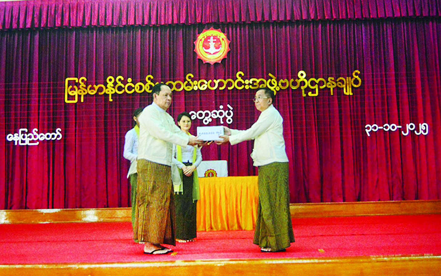 ယင်းနောက် မြန်မာနိုင်ငံစစ်မှုထမ်းဟောင်းအဖွဲ့ ဗဟိုအမှုဆောင်အဖွဲ့ ဥက္ကဋ္ဌက စစ်မှုထမ်းဟောင်းအဖွဲ့ဝင်များအား ဂုဏ်ပြုချီးမြှင့်ငွေများပေးအပ်ရာ တာဝန်ရှိသူတစ်ဦးက လက်ခံရယူခဲ့ကြောင်း သတင်းရရှိသည်။