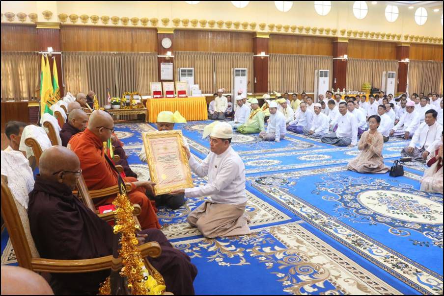 ယင်းနောက် ပြည်နယ် ဝန်ကြီးချုပ်၊ တိုင်းမှူးနှင့် တာဝန်ရှိသူများက ဆရာတော်၊ သံဃာတော်များအား လှူဖွယ်ဝတ္ထုပစ္စည်းများ ဆက်ကပ်လှူဒါန်းပြီး ဗုဒ္ဓဘာသာ ကလျာဏယုဝအသင်းကြီး (Y. M. B. A) (ဗဟို) မှ လှူဒါန်းသော အဂ္ဂမဟာမင်္ဂလဇောတိကဓဇဘွဲ့တံဆိပ်တော်များအား စစ်တွေမြို့ အဘယရက္ခိတကျောင်းတိုက်ဆရာတော် ဂန္ထဝါစကပဏ္ဍိတ ဘဒ္ဒန္တနန္ဒောဘာသနှင့် ရွှေစေတီပရိယတ္တိစာသင်တိုက်ဆရာတော် အဂ္ဂမဟာဂဏ္ဏဝါသဒ္ဓမ္မဇောတိကဓဇ ဒေါက်တာဘဒ္ဒန္တ အရိယဝံသတို့ထံသို့ လည်းကောင်း၊ မဟာမင်္ဂလဇောတိကဓဇဘွဲ့တံဆိပ်တော်များအား စစ်တွေမြို့ သဲချောင်း ဘုန်းတော်ကြီးကျောင်းတိုက်ဆရာတော် ဘဒ္ဒန္တစိန္တိတနှင့် ရွှေတောင်ကျောင်းတိုက် ဆရာတော် ဘဒ္ဒန္တနန္ဒိယတို့ထံသို့လည်းကောင်း အသီးသီးဆက်ကပ်လှူဒါန်းကြသည်။