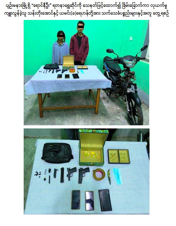 နေပြည်တော်ပြည်ထောင်စုနယ်မြေ၊ ပျဉ်းမနားမြို့ရှိ “ရောင်နီဦး” ရတနာရွှေဆိုင်ကို နိုဝင်ဘာလ ၁၀ ရက်နေ့က သေနတ်ဖြင့်ထောက်၍ ခြိမ်းခြောက်ကာ လုယက်မှုကျူးလွန်ခဲ့သူ အမျိုးသားတစ်ဦးနှင့် အမျိုးသမီးတစ်ဦးတို့အား ဖမ်းဆီးရမိခဲ့ကြောင်း မြန်မာနိုင်ငံရဲတပ်ဖွဲ့မှ သိရှိရသည်။