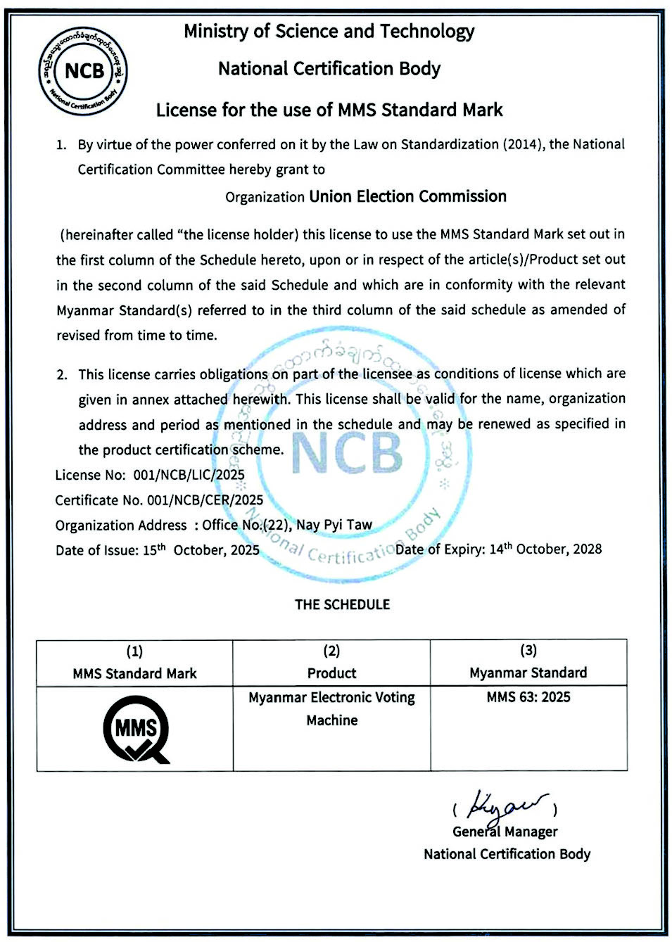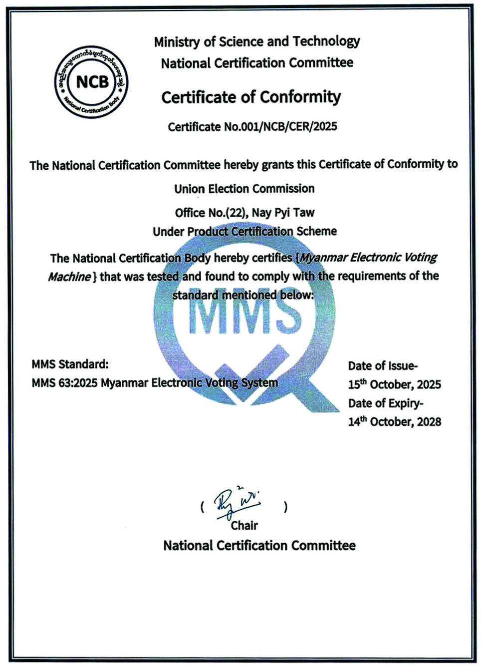 ယခုအခါ မြန်မာအီလက်ထရောနစ်မဲပေးစက်နှင့်စပ်လျဉ်း၍ မြန်မာအီလက်ထရောနစ် မဲပေးစက်ဆိုင်ရာ စံချိန်စံညွှန်းကို အမျိုးသားစံချိန်စံညွှန်းကောင်စီက မြန်မာစံချိန်စံညွှန်း (MMS)အဖြစ်လည်းကောင်း၊ အမျိုးသားအဆင့်အရည်အသွေးထောက်ခံချက်ထုတ်ပေးရေးဆိုင်ရာ ကော်မတီ(National Certification Committee - NCC)မှ မြန်မာအီလက်ထရောနစ်မဲပေးစက် (MEVM)၏ အရည်အသွေးသည် စံချိန်စံညွှန်းပါ စံသတ်မှတ်ချက်များနှင့် ကိုက်ညီမှုရှိကြောင်း စိစစ်အတည်ပြုထုတ်ပေးခဲ့သည့် အရည်အသွေးကိုက်ညီမှုထောက်ခံချက် (Certification of Conformity - CoC) လက်မှတ်ကိုလည်းကောင်း၊ အမျိုးသားအဆင့် အရည်အသွေးထောက်ခံချက် ထုတ်ပေးရေးအဖွဲ့ (National Certification Body - NCB)မှ ထုတ်ပေးသည့် မြန်မာစံချိန်စံညွှန်း အမှတ်တံဆိပ် (MMS Standard Mark) အသုံးပြုခွင့် လိုင်စင်ကိုလည်းကောင်းရရှိပြီးဖြစ်ပါကြောင်း သတင်းထုတ်ပြန်အပ်ပါသည်။