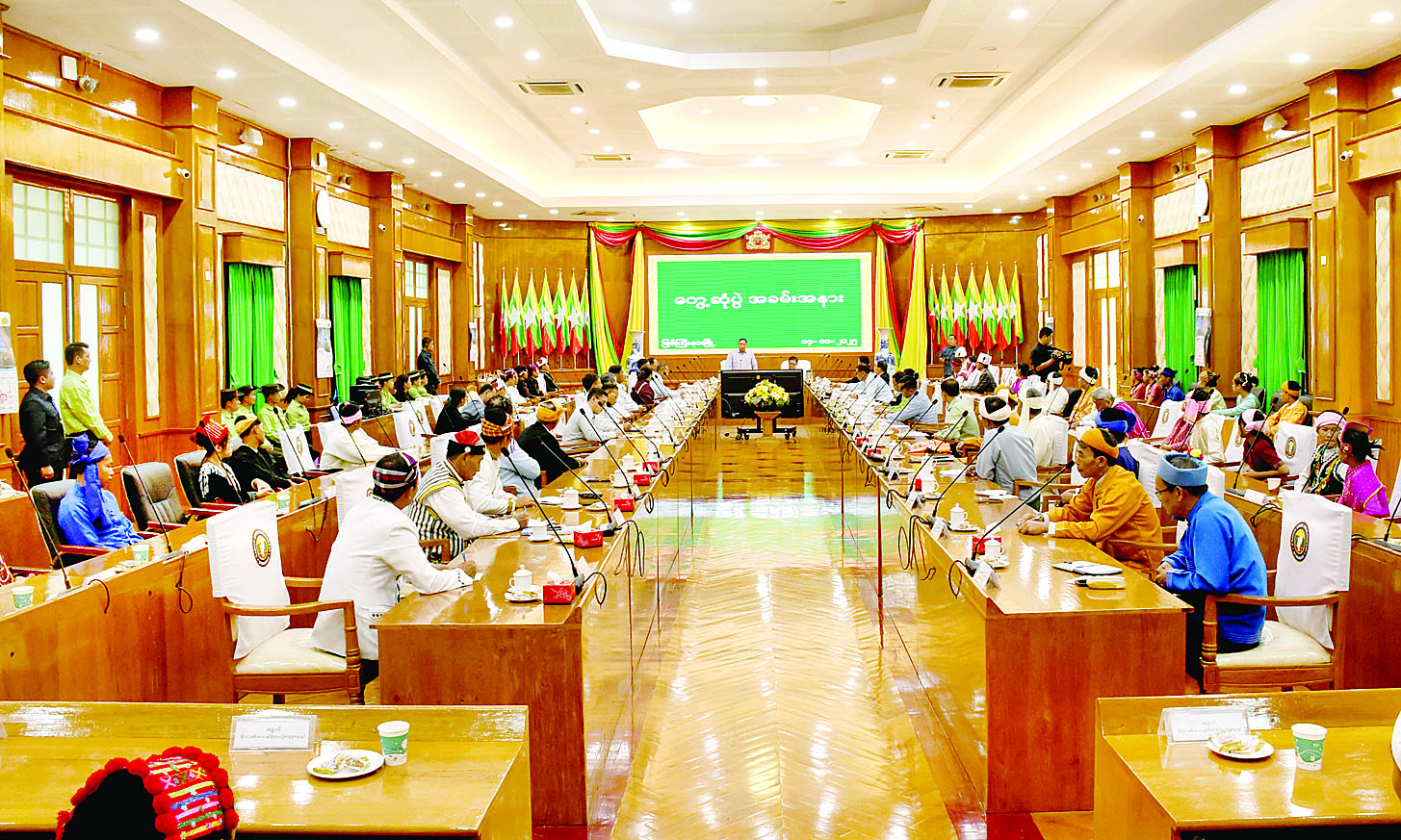 ထို့နောက် ပြည်နယ်တိုင်းရင်းသားရေးရာဝန်ကြီး ဦးကျော်မင်းခိုင်က ပြည်နယ်အတွင်း တိုင်းရင်းသားရေးရာကိစ္စရပ်များနှင့် စပ်လျဉ်း၍ ပြည်ထောင်စုဝန်ကြီးဌာနနှင့် ညွှန်ကြားချက်များနှင့်အညီ ဖြည့်ဆည်းဆောင်ရွက်ပေးနေမှုအခြေအနေများကို ရှင်းလင်းတင်ပြပြီး တက်ရောက်လာကြသည့် ကချင်တိုင်းရင်းသားမျိုးနွယ်စု ခြောက်မျိုး၊ ရှမ်းတိုင်းရင်းသား မျိုးနွယ်ငါးမျိုး၊ ဗမာတိုင်းရင်းသားနှင့် ကရင်၊ ချင်း၊ ရခိုင် စသည့် တိုင်းရင်းသားစာပေနှင့် ယဉ်ကျေးမှုအဖွဲ့ခေါင်းဆောင်များက တိုင်းရင်းသားမျိုးနွယ်စုအလိုက် စာပေယဉ်ကျေးမှု ထိန်းသိမ်းရေးလုပ်ငန်းများ ဆောင်ရွက်ရာတွင် လိုအပ်ချက်များ၊ ဖြည့်ဆည်းပံ့ပိုး ပေးရမည့်ကိစ္စရပ်များကို တင်ပြဆွေးနွေးကြသည်။