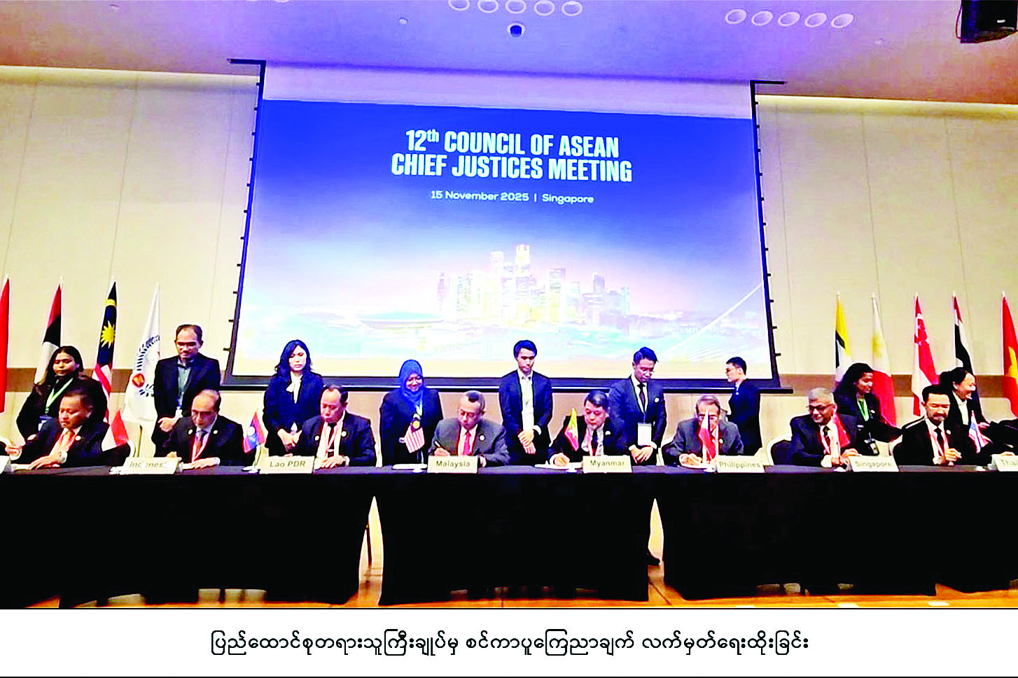 ပြည်ထောင်စု တရားသူကြီးချုပ် ဦးဆောင်သော မြန်မာကိုယ်စားလှယ်အဖွဲ့သည် (၁၂) ကြိမ်မြောက် အာဆီယံတရားသူကြီးချုပ်များ ကောင်စီအစည်းအဝေးနှင့်အတူ ပူးတွဲကျင်းပသည့် ဆွေးနွေးပွဲနှင့် အစည်းအဝေးများသို့ တက်ရောက်ခဲ့ရာ နိုဝင်ဘာ ၁၃ ရက်တွင် စင်ကာပူနိုင်ငံ အပြည်ပြည်ဆိုင်ရာ ကူးသန်းရောင်းဝယ်ရေးတရားရုံးနှင့် စင်ကာပူနိုင်ငံဥပဒေအကယ်ဒမီတို့ ပူးပေါင်းကျင်းပသည့် အပြည်ပြည်ဆိုင်ရာ အငြင်းပွားမှုများဆိုင်ရာဆွေးနွေးပွဲ (SICC-SAL Seminar on International Disputes)၊ နိုဝင်ဘာ ၁၄ ရက်တွင် လူမွဲခံယူခြင်းဆိုင်ရာ အာဆီယံတရားသူကြီးများ အစည်းအဝေး (ASEAN Insolvency Judges Meeting)၊ အာဆီယံဒေသတွင်း နိုင်ငံဖြတ်ကျော် ဥပဒေကျင့်သုံးမှုဆိုင်ရာဆွေးနွေးပွဲ (Seminar on Transnational Practice of Law in ASEAN)၊ လူမွဲခံယူခြင်းဆိုင်ရာ အာဆီယံတရားသူကြီးများနှင့် ကျွမ်းကျင်ပညာရှင်များ အစည်းအဝေး (ASEAN Insolvency Judges and Practitioners Meeting) နှင့် အသိဉာဏ်ပစ္စည်းမူပိုင်ခွင့်ဆိုင်ရာ အာဆီယံတရားသူကြီးများနှင့် ကျွမ်းကျင်ပညာရှင်များ အစည်းအဝေး (ASEAN IP Judges and Practitioners Meeting) တို့သို့ တက်ရောက်ဆွေးနွေးခဲ့သည်။
