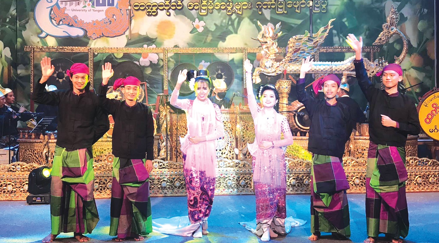 "ပထမ ရာပြည့်အထိမ်းအမှတ် အငြိမ့်ပြိုင်ပွဲလုပ်မယ် ဆိုပြီး ကျောင်းကိုအကြောင်းကြားစာ ရောက်လာ ပါတယ်။ အဲဒီမှာ တက္ကသိုလ်ကိုယ်စားပြုအဖွဲ့ထွက်ဖို့ ပြိုင်ပွဲလုပ်ပါ တယ်။ အဲဒီပြိုင်ပွဲကို ဝင်ပြိုင်ရင်းနဲ့ ပထမရသွားတာပါ။ အကအနေနဲ့ကတော့ သမီးက ၄ နှစ်သမီး အရွယ်ကတည်းက ကခဲ့တာပါ။ လက်ဦးဆရာကတော့ တစ်ခိုင်လုံးရွှေ ဒေါ်အေးအေးမြင့်ပါ။ နောက်တော့ အကဆရာမ ဒေါ်စမ်းရီ၊ ဒေါ်အေးအေးချို၊ လူရွှင်တော်ဗေဒါရဲ့အမျိုးသမီး၊ အနုပညာအသင်းမှာဆိုရင် မိုးနတ်သူဇာ ဒေါ်သီတာဝင်း၊ ဆရာမဒေါ်မူမူခင်၊ ဆရာမဒေါ်ခင်နှင်းနှင်းကြည်တို့က သင်ပေးပါတယ်။ ဆိုကရေးတီး ပြိုင်ပွဲတွေမှာလည်း ဝင်ပြိုင်ခဲ့ပြီး ဆုတွေလည်းရခဲ့ပါတယ်။ အခုဒီပွဲအတွက် သင်ကြားပေးတဲ့ ဆရာမကတော့ အမျိုးသားယဉ်ကျေးမှုနှင့်အနုပညာတက္ကသိုလ်မှ ကထိက ဆရာမဒေါ်ခိုင်သဇင်သင်းပါ။ ဒီပွဲက ကိုဗစ်ကာလအတွင်းမှာလည်း ဖြစ်သွားတာ ဆိုတော့ အကသင်ကြားရေးကို Online ကနေ virtual စနစ်နဲ့ ဆရာမခိုင်သဇင်သင်းက သင်ကြားပေးပါတယ်”။