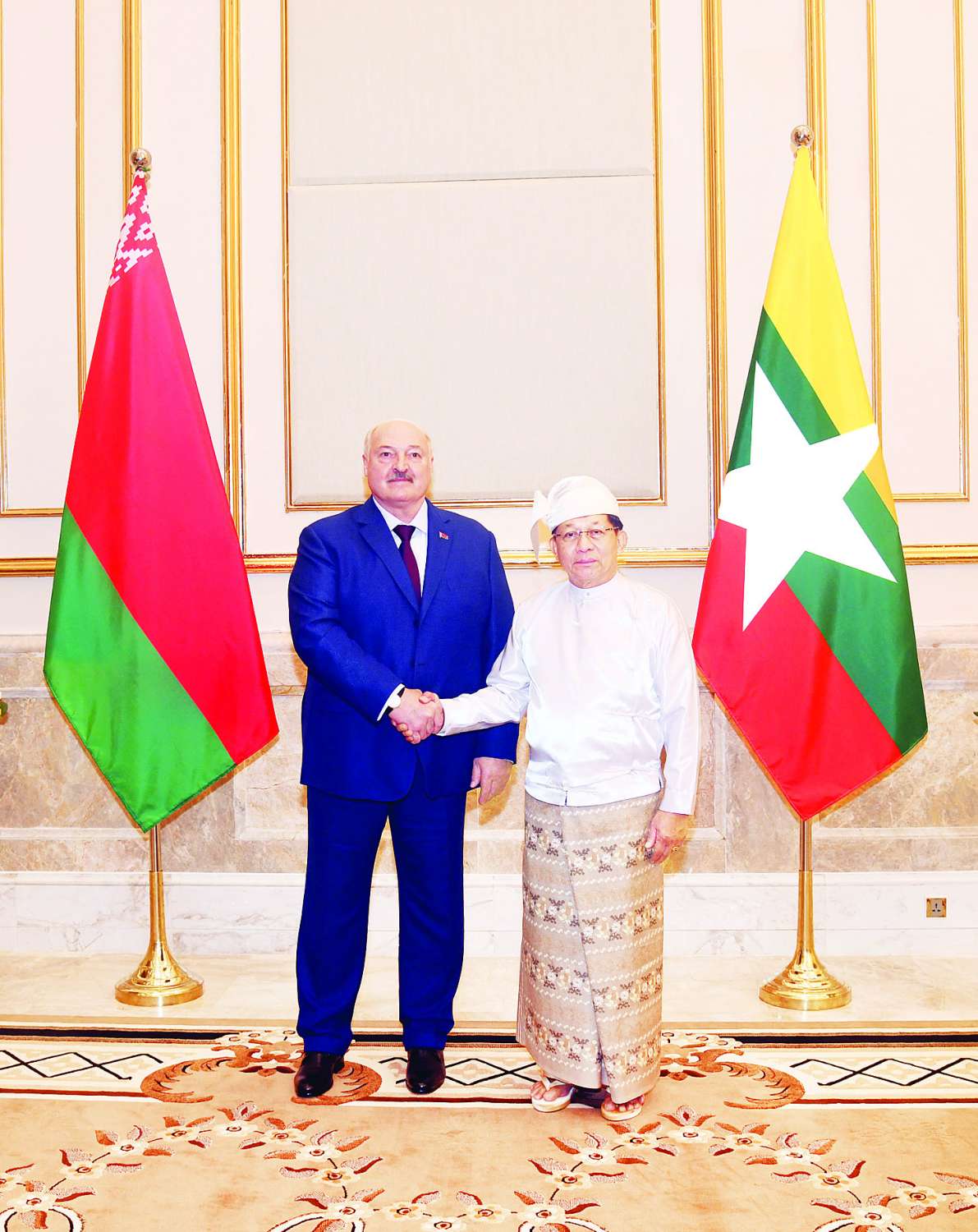 ပြည်ထောင်စုသမ္မတမြန်မာနိုင်ငံတော်ယာယီသမ္မတ နိုင်ငံတော်လုံခြုံရေးနှင့်အေးချမ်းသာယာရေးကော်မရှင်ဥက္ကဋ္ဌ ဗိုလ်ချုပ်မှူးကြီး မင်းအောင်လှိုင်သည် မြန်မာနိုင်ငံသို့ တရားဝင်ချစ်ကြည်ရေးခရီး ရောက်ရှိလာသော ဘယ်လာရုစ်သမ္မတနိုင်ငံသမ္မတ H.E. Mr. Aleksandr Lukashenko အား ယနေ့နံနက်ပိုင်းတွင် သမ္မတအိမ်တော် ဆင်ဖြူတော်ဆောင်ဧည့်ခန်းမ၌ ဂုဏ်ပြုတပ်ဖွဲ့ဖြင့် ကြိုဆိုသည်။