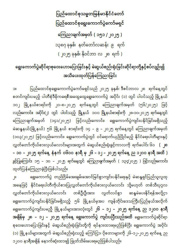 ရွေးကောက်ပွဲဆိုင်ရာစုဝေးဟောပြောခြင်းနှင့် မဲဆွယ်စည်းရုံးခြင်းဆိုင်ရာတို့နှင့်စပ်လျဉ်း၍ အသိပေးထုတ်ပြန်ကြေညာခြင်း
