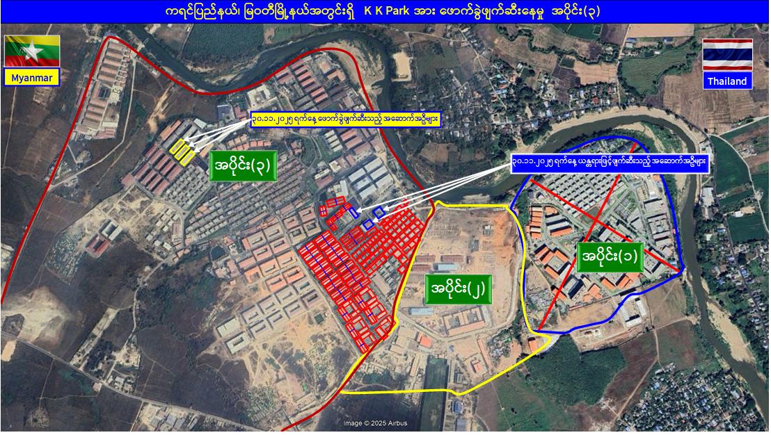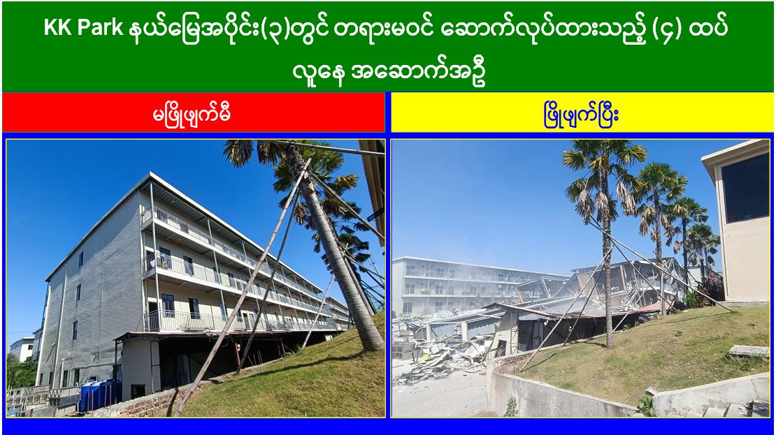 KK Park နယ်မြေအတွင်းရှိ အွန်လိုင်းလိမ်လည်မှုနှင့် လောင်းကစားမှုများကျူးလွန်ရာတွင် အသုံးပြုသည့် အဆောက်အအုံ ၂၇၆ လုံး ဖြိုချဖျက်ဆီးပြီးစီး၊ ရွှေကုက္ကိုလ်နယ်မြေအတွင်းရှိ တရားမဝင်အဆောက်အအုံ ၁၁၉ လုံး ချိပ်ပိတ်သိမ်းဆည်းပြီးဖြစ်
