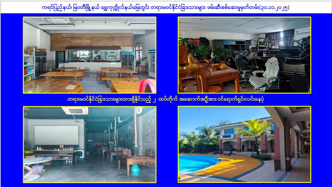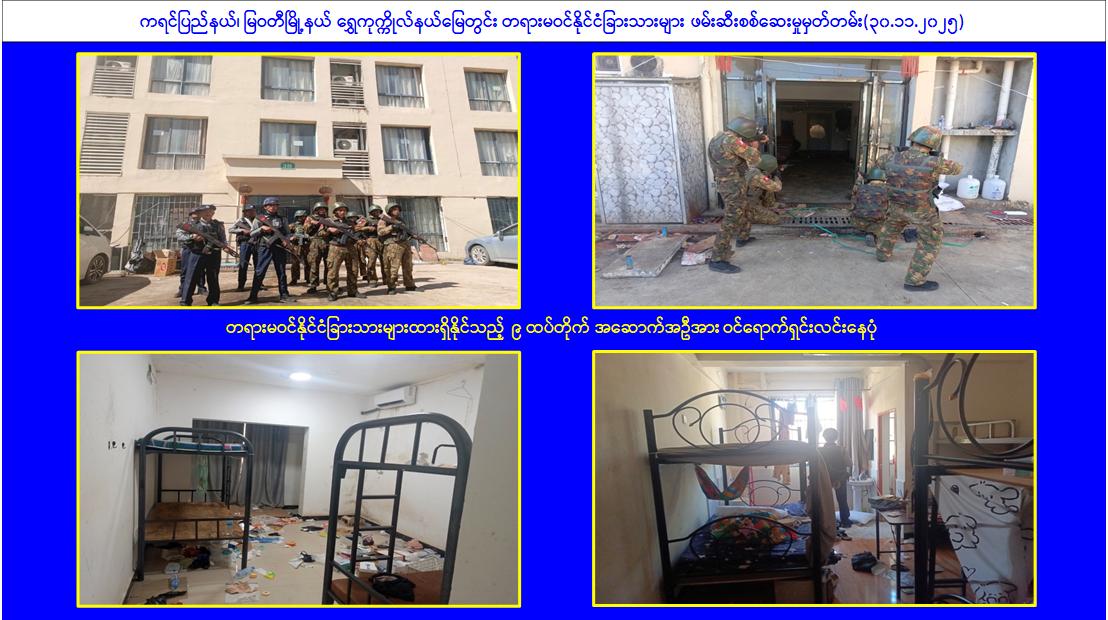 ထို့ပြင် ရွှေကုက္ကိုလ်နယ်မြေအတွင်း အွန်လိုင်းလိမ်လည်မှုများ လုပ်ဆောင်ရာတွင် အသုံးပြုခဲ့သည့် အဆောက်အအုံများအား နိုဝင်ဘာ ၁၈ ရက်မှ စတင်စစ်ဆေးခဲ့ရာ ယနေ့အထိ တရားမဝင်အဆောက်အအုံ ၁၄၀ လုံးကို စစ်ဆေးတွေ့ရှိရပြီး အဆိုပါအဆောက်အအုံများကို ပြန်လည်အသုံးပြုမှုမရှိစေရေးအတွက် သိမ်းဆည်းချိပ်ပိတ်ခြင်းများကို ဆက်လက်ဆောင်ရွက်လျက်ရှိရာ ယနေ့အတွင် တရားမဝင်အဆောက်အအုံ ၁၈ လုံးကို ထပ်မံချိပ်ပိတ်သိမ်းဆည်းနိုင်ခဲ့ပြီး တရားမဝင်အဆောက်အအုံ စုစုပေါင်း ၁၁၉ လုံး ချိပ်ပိတ်သိမ်းဆည်းပြီးဖြစ်ကြောင်း သိရှိရသည်။
