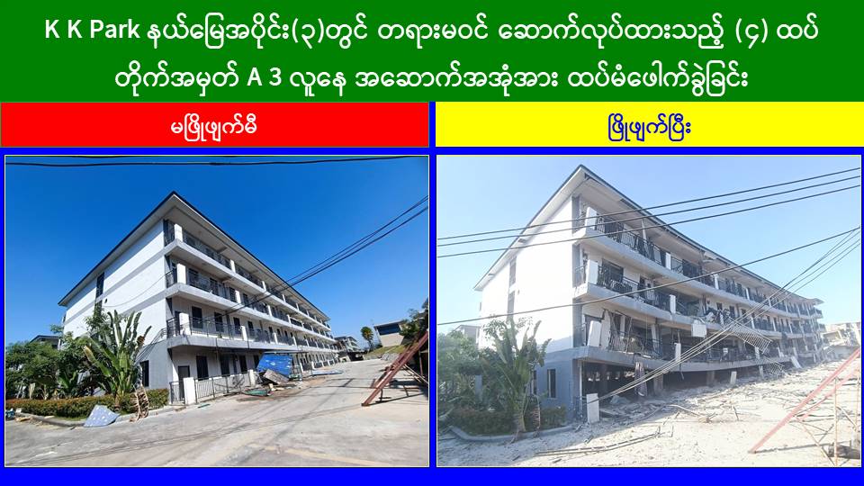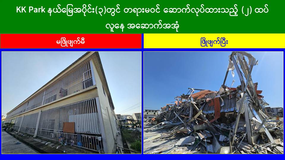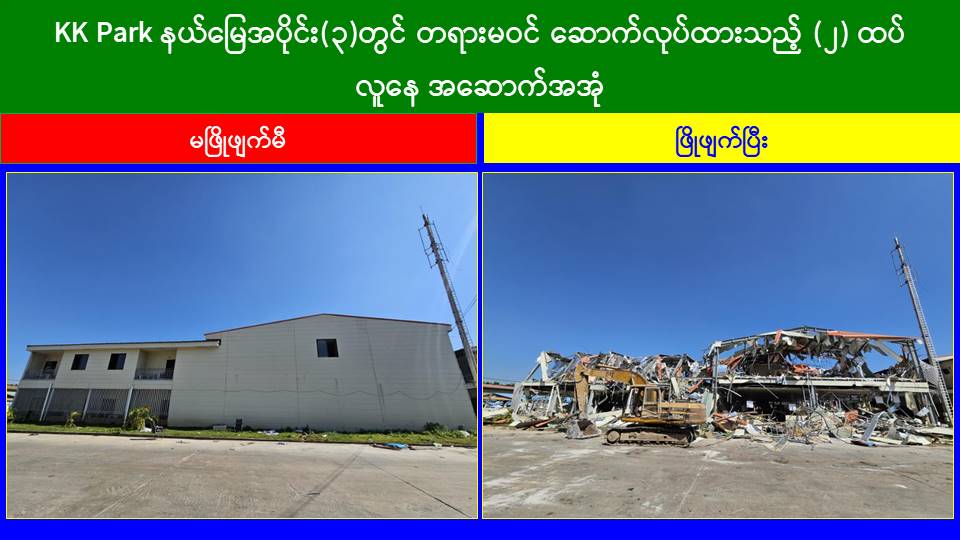 KK Park နယ်မြေအတွင်းရှိ အွန်လိုင်းလိမ်လည်မှုနှင့် လောင်းကစားမှုများကျူးလွန်ရာတွင် အသုံးပြုသည့် အဆောက်အအုံ ၅ လုံး ထပ်မံဖြိုချဖျက်ဆီး၊ ရွှေကုက္ကိုလ်နယ်မြေအတွင်းရှိ တရားမဝင်အဆောက်အအုံ ၂၀ လုံး ထပ်မံချိပ်ပိတ်သိမ်းဆည်း