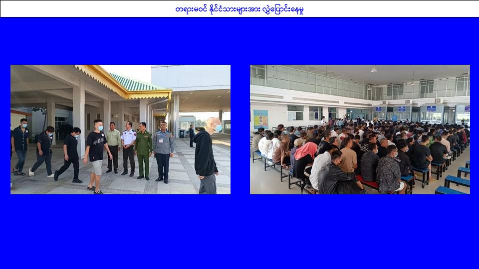 ကရင်ပြည်နယ်၊ မြဝတီမြို့-ရွှေကုက္ကိုလ်နယ်မြေတွင် အွန်လိုင်းလောင်းကစားမှုများ၊ အွန်လိုင်းလိမ်လည်မှုများအပါအဝင် ဒုစရိုက်မှုများကျူးလွန်ခဲ့ကြသည့် တရုတ်နိုင်ငံသား ၂၉၈ ဦး၊ ကင်ညာနိုင်ငံသား ၃၇ ဦး၊ အီသီယိုးပီးယားနိုင်ငံသား ၃၆ ဦး၊ ယူဂန်ဒါနိုင်ငံသား ၁၈ ဦး၊ ဖိလစ်ပိုင်နိုင်ငံသား ၁၅ ဦး၊ ဂါနာနိုင်ငံသား ၂ ဦး၊ ဇင်ဘာဘွေနိုင်ငံသား ၂ ဦး၊ ရဝမ်ဒါနိုင်ငံသား ၁ ဦး၊ တိုဂိုနိုင်ငံသား ၁ နှင့် ဘီနင်နိုင်ငံသား ၁ ဦး၊ စုစုပေါင်းပြည်ပနိုင်ငံသား ၄၁၁ ဦးတို့အား ယနေ့တွင် မြန်မာ-ထိုင်း အမှတ်(၂)ချစ်ကြည်ရေးတံတားမှတစ်ဆင့် သက်ဆိုင်ရာနိုင်ငံများသို့ လူသားချင်းစာနာထောက်ထားမှုနှင့် နိုင်ငံအချင်းချင်း ချစ်ကြည်ရင်းနှီးမှုတို့ကို ရှေးရှု၍ ဥပဒေလုပ်ထုံးလုပ်နည်းများနှင့်အညီ ထပ်မံလွှဲပြောင်းပေးသည်။