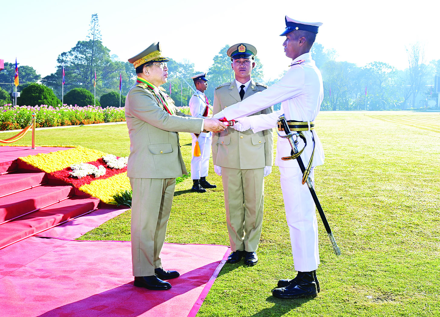ယင်းနောက် နိုင်ငံတော်လုံခြုံရေးနှင့် အေးချမ်းသာယာရေးကော်မရှင်ဥက္ကဋ္ဌ တပ်မတော်ကာကွယ်ရေးဦးစီးချုပ် ဗိုလ်ချုပ်မှူးကြီး သတိုးမဟာသရေစည်သူ သတိုးသီရိသုဓမ္မ မင်းအောင်လှိုင်သည် ဗိုလ်လောင်းတပ်ခွဲများ၏ အလေးပြုခြင်းကို ခံယူပြီးနောက် စစ်ရေးပြအခမ်းအနားမှ ပြန်လည်ထွက်ခွာသည်။