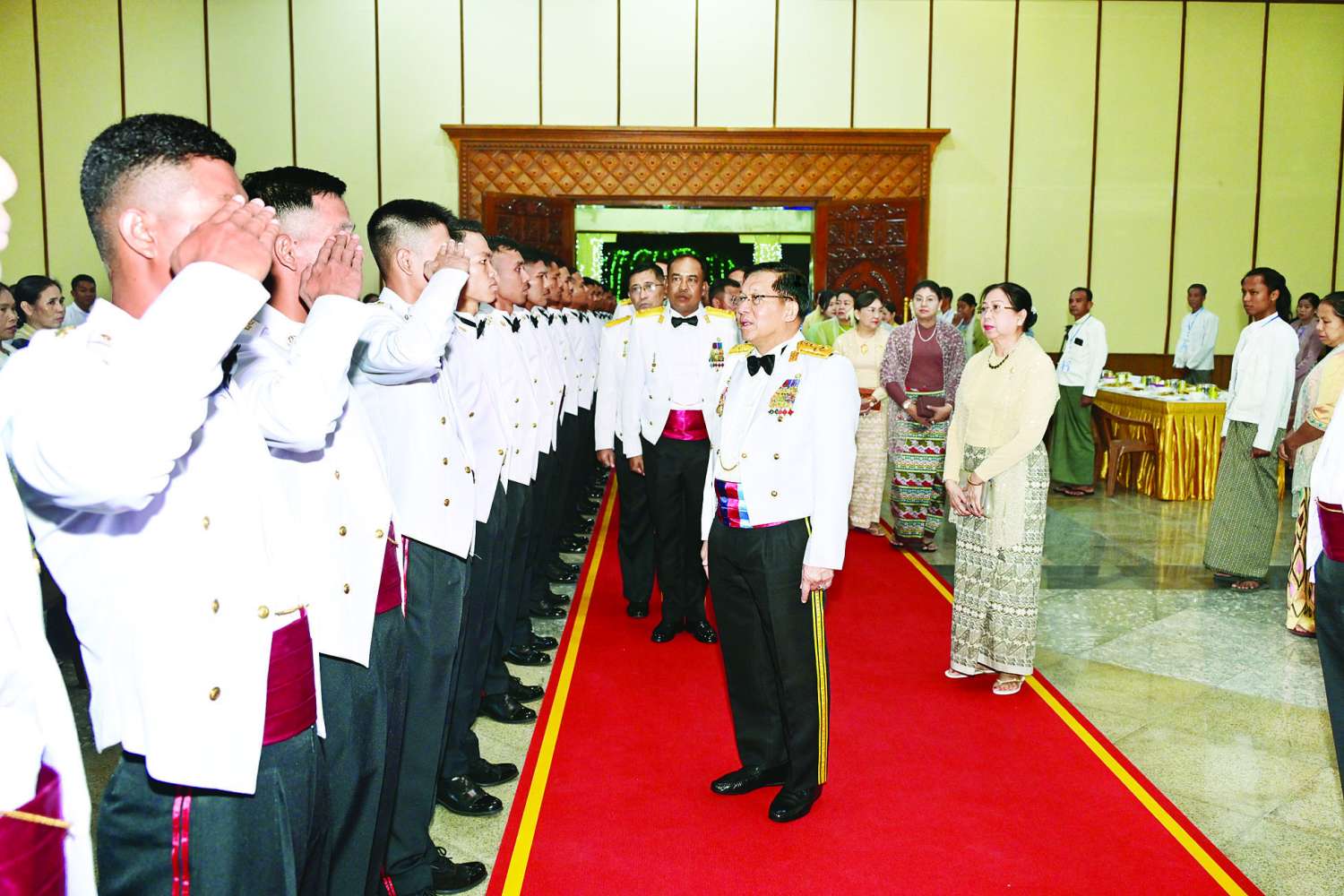 ဦးစွာ နိုင်ငံတော်လုံခြုံရေးနှင့် အေးချမ်းသာယာရေးကော်မရှင်ဥက္ကဋ္ဌ တပ်မတော်ကာကွယ်ရေးဦးစီးချုပ် ဗိုလ်ချုပ်မှူးကြီး မင်းအောင်လှိုင်က သင်တန်းဆင်းအရာရှိများအား တစ်ဦးချင်း ရင်းရင်းနှီးနှီးလိုက်လံနှုတ်ဆက်သည်။ ထို့နောက် နိုင်ငံတော်လုံခြုံရေးနှင့် အေးချမ်းသာယာရေးကော်မရှင်ဥက္ကဋ္ဌ တပ်မတော်ကာကွယ်ရေးဦးစီးချုပ် ဗိုလ်ချုပ်မှူးကြီး မင်းအောင်လှိုင်နှင့် အဖွဲ့ဝင်များသည် သင်တန်းဆင်းအရာရှိများ၊ ညစာစားပွဲတက်ရောက်လာကြသူများနှင့်အတူ ဂုဏ်ပြုညစာကို အတူတကွသုံးဆောင်ကြသည်။