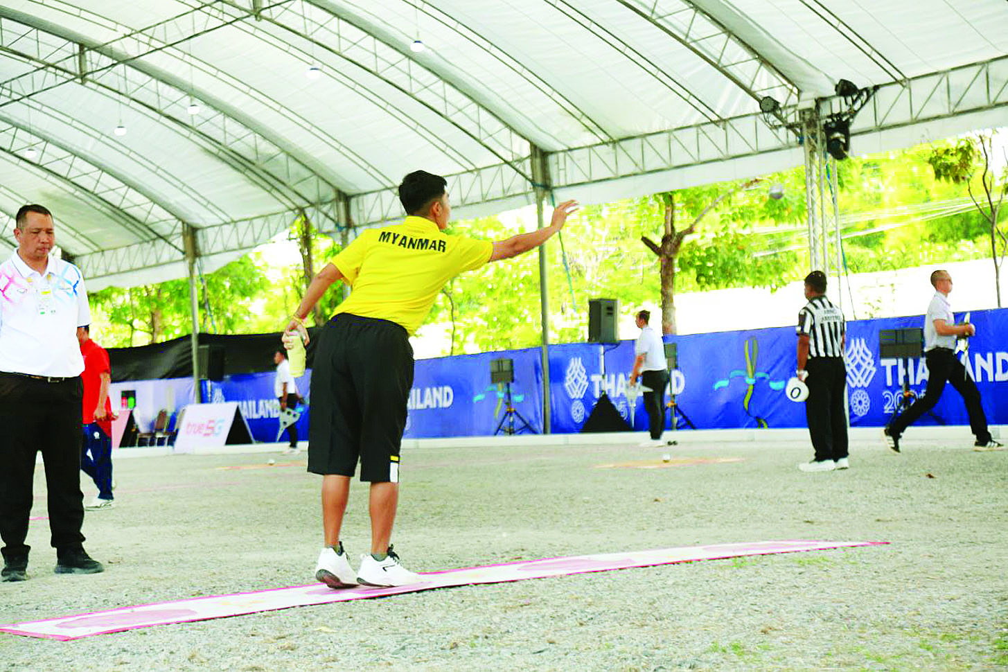 မြန်မာနိုင်ငံအိုလံပစ်ကော်မတီဥက္ကဋ္ဌ အားကစားနှင့်လူငယ်ရေးရာဝန်ကြီးဌာနနှင့် ဟိုတယ်နှင့်ခရီးသွားလာရေးဝန်ကြီးဌာန ပြည်ထောင်စုဝန်ကြီး Jeng Phang နော်တောင်၊ ပြန်ကြားရေးဝန်ကြီးဌာန ဒုတိယဝန်ကြီး ဦးရဲတင့်၊ ရန်ကုန်တိုင်းဒေသကြီး လူမှုရေးရာဝန်ကြီး ဦးဌေးအောင်၊ ထိုင်းနိုင်ငံဆိုင်ရာ မြန်မာနိုင်ငံသံအမတ်ကြီး ဦးဇော်ဇော်စိုး၊ စစ်သံမှူးကြီး ဗိုလ်မှူးချုပ် ဝင်းသူလင်း၊ မြန်မာအားကစားအဖွဲ့ခေါင်းဆောင်နှင့် အုပ်ချုပ်မှုအဖွဲ့ဝင်များ၊ မြန်မာနိုင်ငံပိုက်ကျော်ခြင်းအဖွဲ့ချုပ်ဥက္ကဋ္ဌနှင့် တာဝန်ရှိသူများ၊ မြန်မာနိုင်ငံအားကစားအဖွဲ့ချုပ်ဥက္ကဋ္ဌနှင့် တာဝန်ရှိသူများ တက်ရောက်ကြည့်ရှုအားပေးကြသည်။