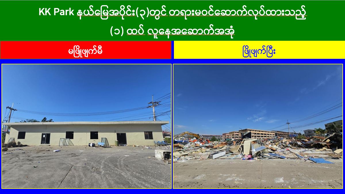 ယနေ့တွင် မြဝတီ-မဲ့ထော်သလေး(KK Park) အပိုင်း(၃)နယ်မြေအတွင်းရှိ အွန်လိုင်းလိမ်လည်လောင်းကစားမှုများကျူးလွန်ရာတွင် အသုံးပြုခဲ့သည့် တရားမဝင် ၄ ထပ် အဆောက်အအုံ ၁ လုံး၊ ၂ ထပ်အဆောက်အအုံ ၂ လုံးနှင့် တစ်ထပ်အဆောက်အအုံ ၃ လုံး စုစုပေါင်း တရားမဝင် အဆောက်အအုံ ၆ လုံးတို့ကို ထပ်မံဖြိုချဖျက်ဆီးခဲ့သဖြင့် KK Park နယ်မြေအတွင်းရှိ တရားမဝင်အဆောက်အအုံ စုစုပေါင်း ၆၃၅ လုံးအနက် ၅၂၅ လုံးကို စနစ်တကျဖြိုချဖျက်ဆီးပြီးဖြစ်ကြောင်း သိရှိရသည်။