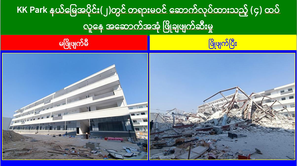 KK Park နယ်မြေအတွင်း အွန်လိုင်းလိမ်လည်လောင်းကစားမှု ကျူးလွန်ရာတွင် အသုံးပြုသည့် တရားမဝင်အဆောက်အအုံ ၅၅၅ လုံး စနစ်တကျဖြိုချဖျက်ဆီးပြီးဖြစ်