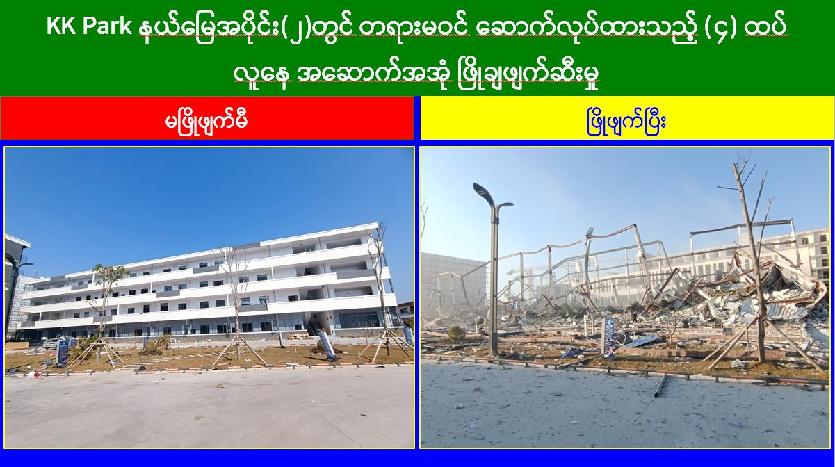 မြဝတီ-မဲထော်သလေး ယနေ့တွင် (KK Park) အပိုင်း (၃) နယ်မြေအတွင်းရှိ အွန်လိုင်းလိမ်လည်လောင်းကစားမှုများ ကျူးလွန်ရာတွင် အသုံးပြုခဲ့သည့် တရားမဝင် ၆ ထပ် အဆောက်အအုံ ၄ လုံးနှင့် အပိုင်း (၂) နယ်မြေအတွင်းရှိ အွန်လိုင်းလိမ်လည်လောင်းကစားမှုများ ကျူးလွန်ရာတွင် အသုံးပြုခဲ့သည့် တရားမဝင် ၄ ထပ် အဆောက်အအုံ ၂ လုံး၊ စုစုပေါင်း တရားမဝင် အဆောက်အအုံ ၆ လုံးတို့ကို ထပ်မံဖြိုချဖျက်ဆီးခဲ့သဖြင့် KK Park နယ်မြေအတွင်းရှိ တရားမဝင်အဆောက်အအုံ စုစုပေါင်း ၆၃၅ လုံး အနက် ၅၅၅ လုံးကို စနစ်တကျ ဖြိုချဖျက်ဆီးပြီးဖြစ်ကြောင်း သိရှိရသည်။