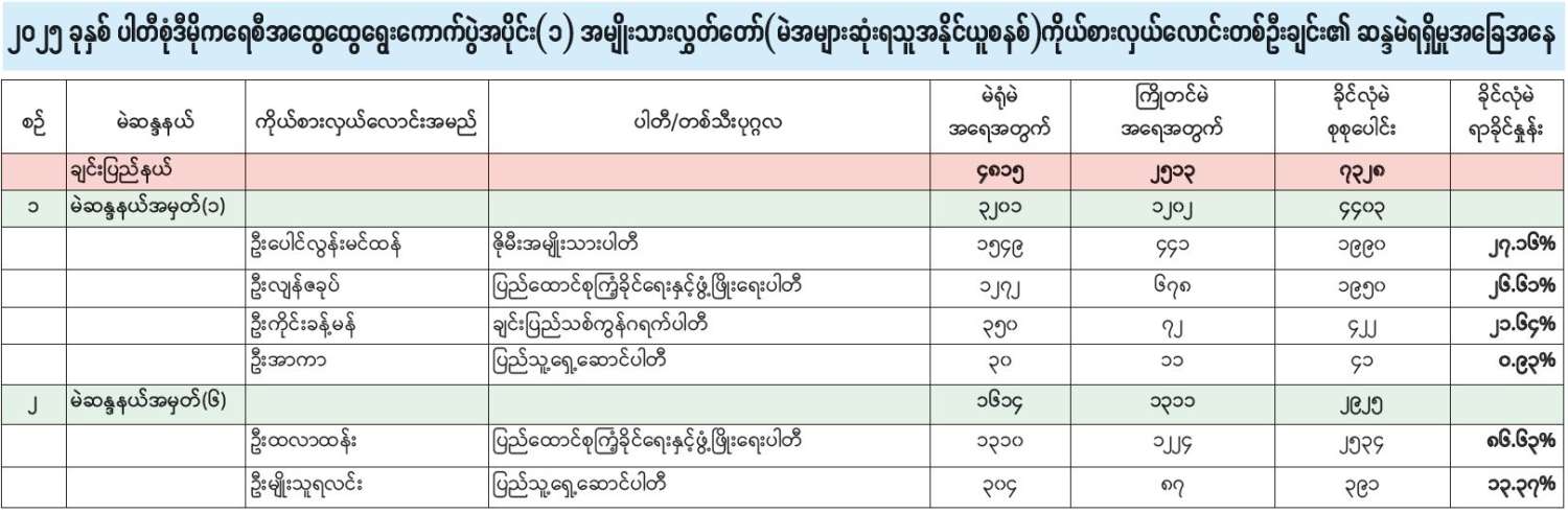 ၂၀၂၅ ခုနှစ် ပါတီစုံဒီမိုကရေစီအထွေထွေရွေးကောက်ပွဲအပိုင်း (၁) အမျိုးသားလွှတ်တော် (မဲအများဆုံးရသူအနိုင်ယူစနစ်) ကိုယ်စားလှယ်လောင်းတစ်ဦးချင်း၏ ဆန္ဒမဲရရှိမှုအခြေအနေ