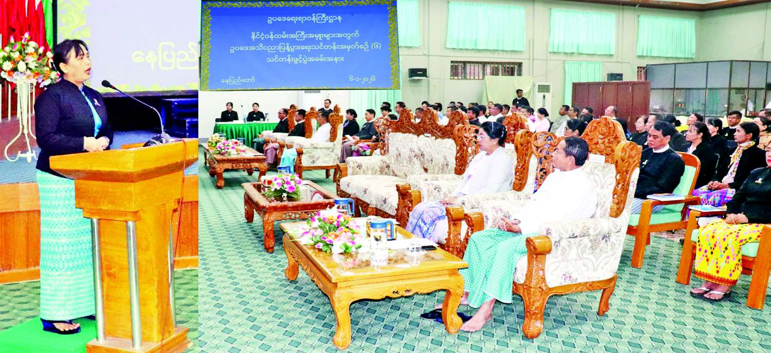 ယခုသင်တန်းတွင် လက်တွေ့ဘဝတွင်အသုံးချ၍ရပြီး ရုံးလုပ်ငန်းများနှင့်လည်း ဆက်စပ်သည့် နိုင်ငံတော်ဖွဲ့စည်းပုံအခြေခံဥပဒေ၊ ဥပဒေမူကြမ်းရေးဆွဲခြင်း၊ စီးပွားရေးစာချုပ်စာတမ်းများ စစ်ဆေးခြင်း၊ အပြည်ပြည်ဆိုင်ရာ စာချုပ်များနှင့်ပတ်သက်သည့် ကိစ္စရပ်များ၊ တရားစွဲနှင့်အမှုလိုက်လုပ်ငန်း၊ အထူးဥပဒေ၊ တရားမဥပဒေ စသည်တို့ကို ပို့ချပေးမည်ဖြစ်ကြောင်း၊ ဥပဒေအသိပညာ ဒီပလိုမာတစ်နှစ်သင်တန်းကိုလည်း စတင်ဖွင့်လှစ်နေပြီဖြစ်ကြောင်း၊ ဥပဒေရေးရာဝန်ကြီးဌာနအနေဖြင့် ၂၀၁၅ ခုနှစ်မှစ၍ မဟာဗျူဟာများ ချမှတ်ဆောင်ရွက်လျက်ရှိပြီး ယခု ၂၀၂၅ မှ ၂၀၂၉ အထိ “ပြည်သူ့အတွက် တည်ဆောက်လျက် ဥပဒေယုံကြည်ချက်” “Building Legal Trust For The People” ဟူသည့် မဟာဗျူဟာအရ ဥပဒေအသိပညာ ပြန့်ပွားရေးဆိုသည့် အချက်သည် အဓိကဆောင်ရွက်သည့် အချက်ဖြစ်ကြောင်း၊ လူတိုင်းဥပဒေအသိ ပညာပြန့်ပွားရမည်၊ အထူးသဖြင့် နိုင်ငံတော်၏အဆင့်မြင့်တာဝန် ထမ်းဆောင်နေသည့် အရာရှိကြီးများသည် ဥပဒေအသိပညာ ရှိရမည်ဆိုသည့် ရည်ရွယ်ချက်ဖြင့် တရားဥပဒေစိုးမိုးရေးထဲမှ အဓိကကျသည့် အညွှန်းကိန်း Index အနေဖြင့် ဆောင်ရွက်နေခြင်း ဖြစ်ကြောင်း၊ Grade 11 / 12 ကျောင်းသား ကျောင်းသူများ ကအစဥပဒေအသိပညာရှိစေရေးအတွက် သင်ရိုးညွှန်းတမ်းများတွင် ထည့်သွင်းရေးဆွဲပြီး ဆရာ ဆရာမများအား Training of Trainner သင်တန်းများ ပို့ချဆောင်ရွက်ပေးလျက်ရှိကြောင်း၊ ယခုသင်တန်းမှရရှိသည့် ဥပဒေအသိပညာများကို မိမိအတွက်၊ မိမိဌာနအဖွဲ့အစည်းအတွက်၊ နိုင်ငံတော်အတွက် အကျိုးရှိစွာ အသုံးချနိုင်ရန်ဆန္ဒပြုပါကြောင်း ပြောကြားသည်။