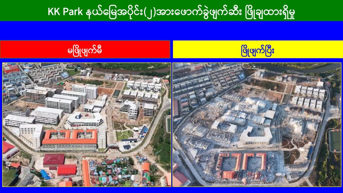 မြန်မာနိုင်ငံအစိုးရအနေဖြင့် အွန်လိုင်းလိမ်လည်လောင်းကစားမှုများ အများဆုံး အခြေချလုပ်ကိုင်လျက်ရှိကြသည့် ရွှေကုက္ကိုလ်နယ်မြေနှင့် KK Park နယ်မြေများရှိတရားမဝင် အဆောက်အအုံများအတွင်း ဝင်ရောက်ရှင်းလင်း၍ အွန်လိုင်းလိမ်လည် လောင်းကစားမှုလုပ်ငန်းစဉ်များတွင် အသုံးပြုခဲ့သည့် သိမ်းဆည်းရမိပစ္စည်းများအား စနစ်တကျဖျက်ဆီးခြင်းနှင့် တရားမဝင်အဆောက်အအုံများအား စနစ်တကျဖြိုချဖျက်ဆီးခြင်းများကို အဖွဲ့စုံပါဝင်သည့် ပူးပေါင်းအဖွဲ့ဖြင့် ဆောင်ရွက်လျက်ရှိရာ ယနေ့တွင်လည်း KK အဖွဲ့စုံပါဝင်သည့် Park နယ်မြေအတွင်းရှိ တရားမဝင်အဆောက်အအုံ ၂ လုံးကို ထပ်မံဖြိုချဖျက်ဆီးခဲ့ကြောင်း သိရှိရသည်။