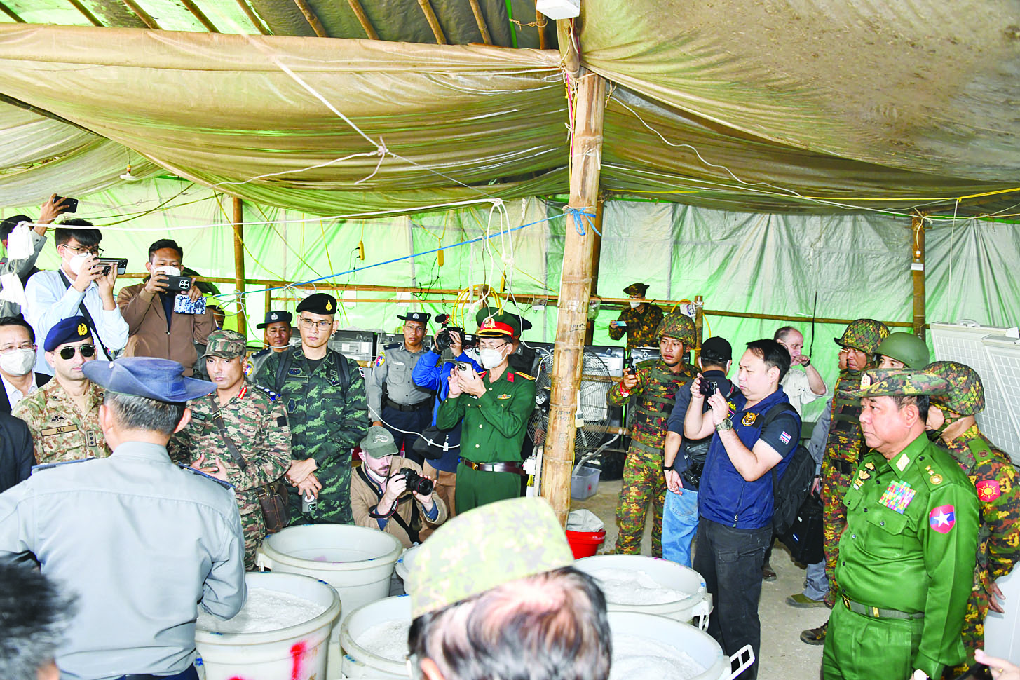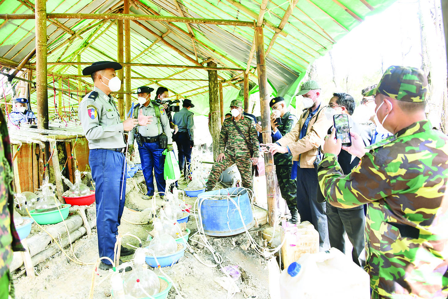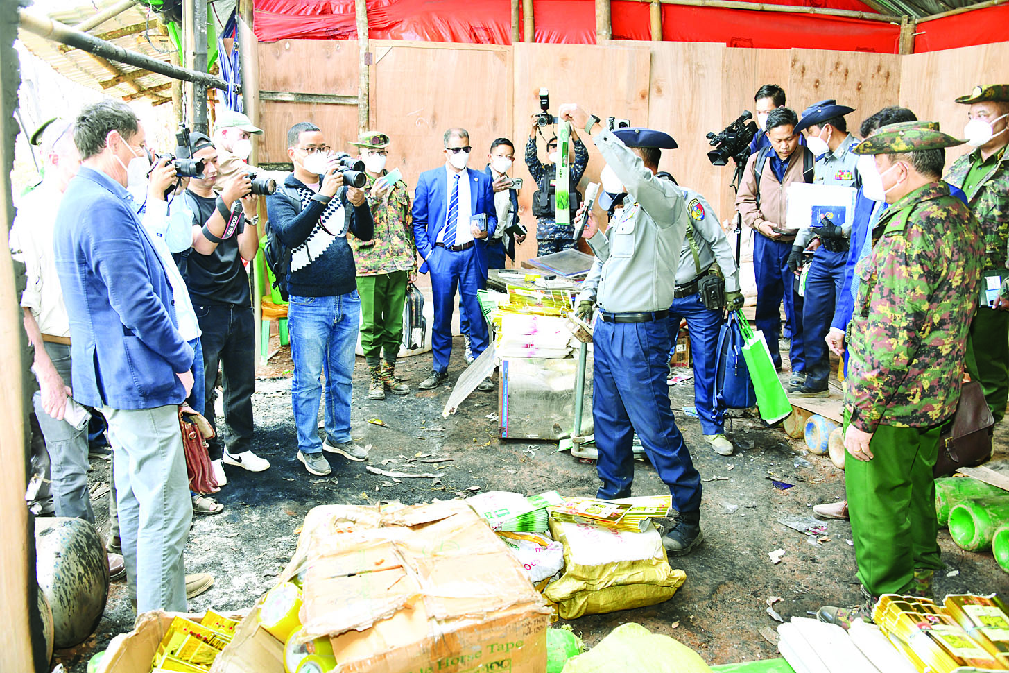 ဆက်လက်၍ ကော်မရှင်အဖွဲ့ဝင် ပြည်ထဲရေးဝန်ကြီးဌာန ပြည်ထောင်စုဝန်ကြီး၊ အမျိုးသားကာကွယ်ရေးနှင့်လုံခြုံရေးကောင်စီ သတင်းထုတ်ပြန်ရေးအဖွဲ့ အဖွဲ့ခေါင်းဆောင် ပြန်ကြားရေးဝန်ကြီးဌာန ဒုတိယဝန်ကြီးနှင့် တာဝန်ရှိသူများ၊ သံတမန်များ၊ သတင်းမီဒီယာအဖွဲ့များသည် ယင်းနေရာ၏ အနောက်တောင်ဘက် ၁၉ ကီလိုမီတာခန့်အကွာ၌ မူးယစ်ဆေးဝါးအဓိကချက်လုပ်သည့်နေရာသို့ ရောက်ရှိကြရာ ဆေးဝါးချက်လုပ်ရာတွင်အသုံးပြုသော ဓာတုပစ္စည်းများ၊ ဆက်စပ်ပစ္စည်းများနှင့်ပတ်သက်၍ မြန်မာနိုင်ငံ၊ မူးယစ်ဆေးဝါးတားဆီးနှိမ်နင်းရေးရဲတပ်ဖွဲ့ တပ်ဖွဲ့မှူး ရဲမှူးချုပ် သန့်လွင်မောင်နှင့် တာဝန်ရှိသူများက ရှင်းလင်းပြောကြားပြီး သိရှိလိုသည့်မေးမြန်းမှုများကို ပြန်လည်ဖြေကြားသည်။