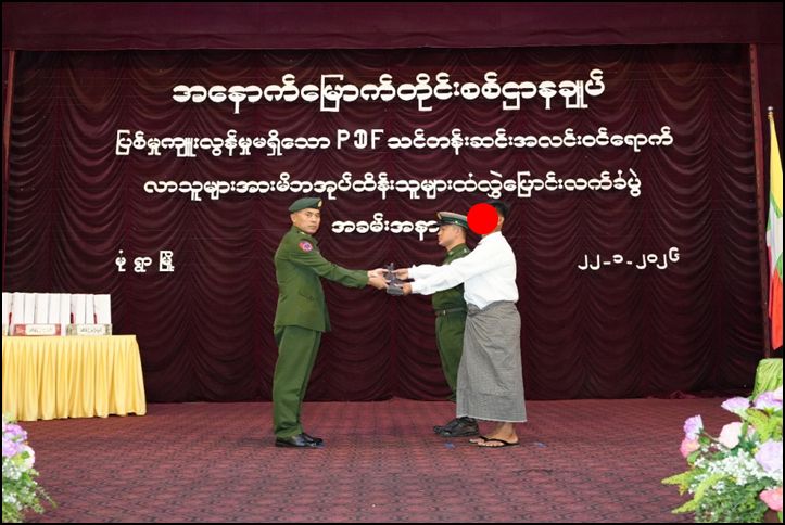 နိုင်ငံတော်နှင့် တပ်မတော်၏ ငြိမ်းချမ်းရေးလုပ်ငန်းစဉ်များကို လက်ခံယုံကြည်သည့် PDF အမည်ခံအဖွဲ့ဝင် အမျိုးသား ၂၂ ဦးနှင့် အမျိုးသမီး ၂ ဦးတို့သည် လက်နက်၊ ခဲယမ်းများနှင့်အတူ ဥပဒေဘောင်အတွင်းသို့ ဝင်ရောက်