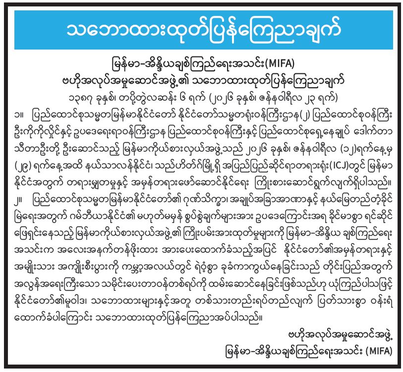 မြန်မာ-အိန္ဒိယချစ်ကြည်ရေးအသင်း (MIFA) ဗဟိုအလုပ်အမှုဆောင်အဖွဲ့၏ သဘောထားထုတ်ပြန်ကြေညာချက်