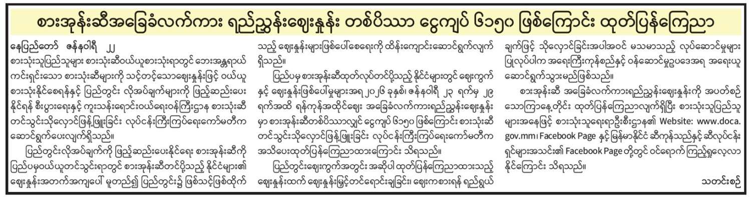 ရန်ကုန်မြို့နှင့် မန္တလေးမြို့အတွက် ရည်ညွှန်းလက်ကားဈေးနှုန်းများနှင့် ပြည်ထောင်စုနယ်မြေ နေပြည်တော်၊ တိုင်းဒေသကြီး/ပြည်နယ် မြို့တော်များအတွက် ရည်ညွှန်းလက်လီဈေးနှုန်းများ