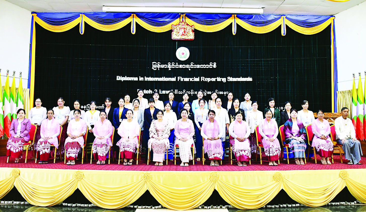 မြန်မာနိုင်ငံစာရင်းကောင်စီမှကြီးမှူး၍ ပြည်ထောင်စုစာရင်းစစ်ချုပ်ရုံး အဆင့်မြင့်စာရင်းကိုင်နှင့် စာရင်းစစ်သင်တန်းကျောင်း နေပြည်တော်တွင်ဖွင့်လှစ်သည့် နိုင်ငံပိုင်ကဏ္ဍအတွက် နိုင်ငံတကာဘဏ္ဍာရေးအစီရင်ခံခြင်းစံများ ဒီပလိုမာသင်တန်းအမှတ်စဉ်(၂) အပိုင်း(၂) (Diploma in International Financial Reporting Standards - Dip IFRS) သင်တန်းဆင်းပွဲအခမ်းအနားကို ယနေ့နံနက်ပိုင်းတွင် နေပြည်တော်ရှိ ပြည်ထောင်စုစာရင်းစစ်ချုပ်ရုံးနဝရတ်ခန်းမ၌ Hybrid စနစ်ဖြင့် ကျင်းပသည်။