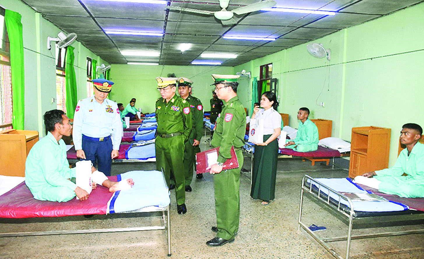 ဧရာဝတီတိုင်းဒေသကြီး ပုသိမ်မြို့ရှိ နယ်မြေခံဆေးတပ်ရင်း၌ တက်ရောက်ဆေးကုသမှုခံယူလျက်ရှိသော အရာရှိ၊ စစ်သည်၊ မိသားစုဝင်များ၊ မြန်မာနိုင်ငံရဲတပ်ဖွဲ့ဝင်များနှင့် ဒေသခံပြည်သူများအား ယနေ့မွန်းလွဲပိုင်းတွင် အနောက်တောင်တိုင်းစစ်ဌာနချုပ် တိုင်းမှူး ဗိုလ်ချုပ် စိုးကျော်ထက်နှင့် အဖွဲ့ဝင်များက သွားရောက်ကြည့်ရှုအားပေးပြီး တစ်ဦးချင်း၏ ရောဂါဖြစ်ပွားမှု၊ ဆေးဝါးကုသပေးထားမှုနှင့် ကျန်းမာရေးတိုးတက်ကောင်းမွန်မှုအခြေအနေများကို ရင်းရင်းနှီးနှီး မေးမြန်းအားပေးစကားပြောကြားကာ ဆေးရုံတက်လူနာများအတွက် ချီးမြှင့်ငွေများနှင့် စားသောက်ဖွယ်ရာများ ပေးအပ်ခဲ့ကြောင်း သတင်းရရှိသည်။