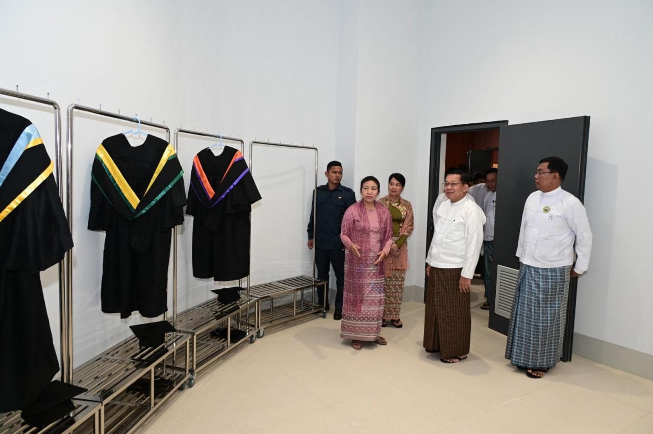 ထို့နောက် Naypyitaw State Academy ဘွဲ့နှင်းသဘင်ခန်းမ (ဘက်စုံသုံးခန်းမ) အတွင်း လှည့်လည်ကြည့်ရှုကြပြီး တာဝန်ရှိသူများ၏ တင်ပြချက်များအပေါ် နိုင်ငံတော်ယာယီသမ္မတ နိုင်ငံတော်လုံခြုံရေးနှင့်အေးချမ်းသာယာရေးကော်မရှင်ဥက္ကဋ္ဌက လိုအပ်သည်များ လမ်းညွှန်မှာကြားသည်။