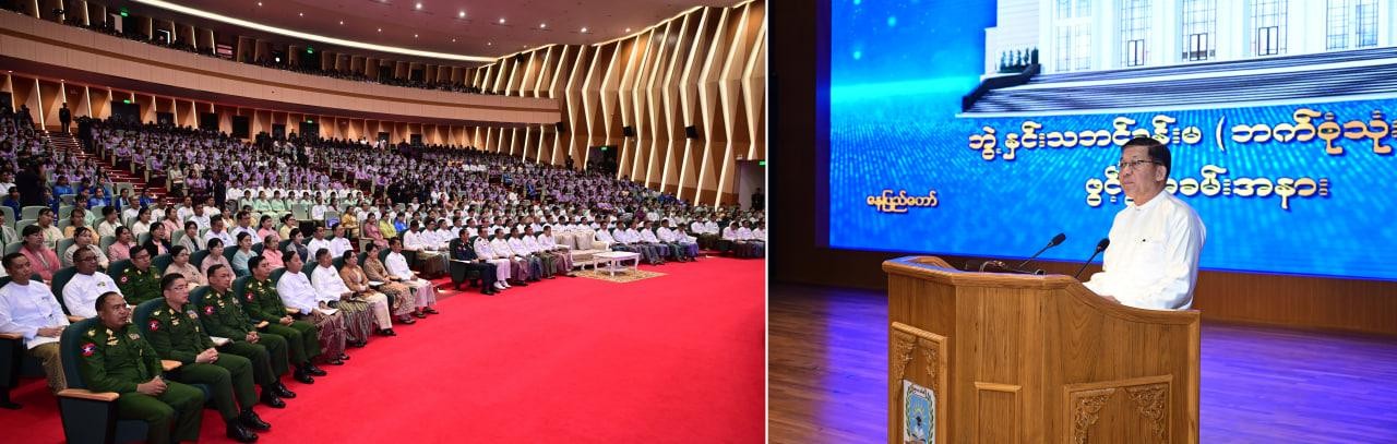 နေပြည်တော်ကောင်စီနယ်မြေ၊ ဇမ္ဗူသီရိမြို့နယ်ရှိ Naypyitaw State Academy (ဘွဲ့နှင်းသဘင်ခန်းမ) ဘက်စုံသုံးခန်းမဖွင့်ပွဲအခမ်းအနားကို ယနေ့နံနက်ပိုင်းတွင် ကျင်းပပြုလုပ်ရာ ပြည်ထောင်စုသမ္မတမြန်မာနိုင်ငံတော်ယာယီသမ္မတ နိုင်ငံတော်လုံခြုံရေးနှင့်အေးချမ်းသာယာရေးကော်မရှင်ဥက္ကဋ္ဌ ဗိုလ်ချုပ်မှူးကြီး မင်းအောင်လှိုင် တက်ရောက်ဖွင့်လှစ်ပေးပြီး အမှာစကားပြောကြားသည်။