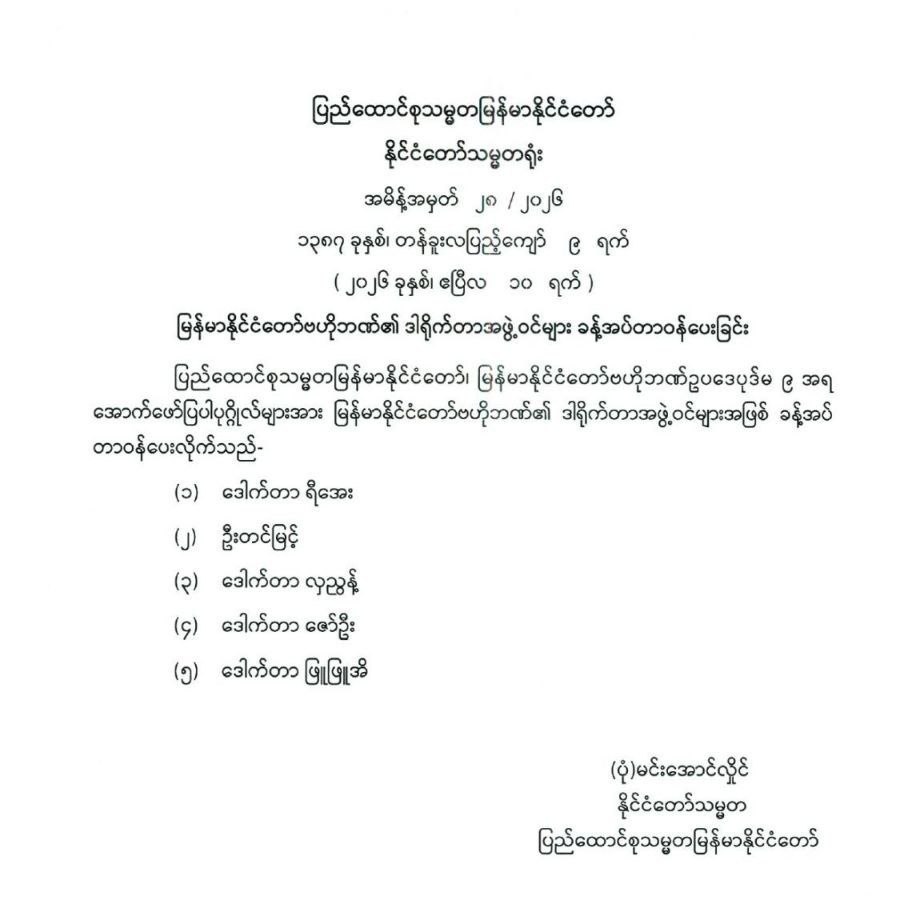 မြန်မာနိုင်ငံတော်ဗဟိုဘဏ်၏ ဒါရိုက်တာအဖွဲ့ဝင်များ ခန့်အပ်တာဝန်ပေးခြင်း