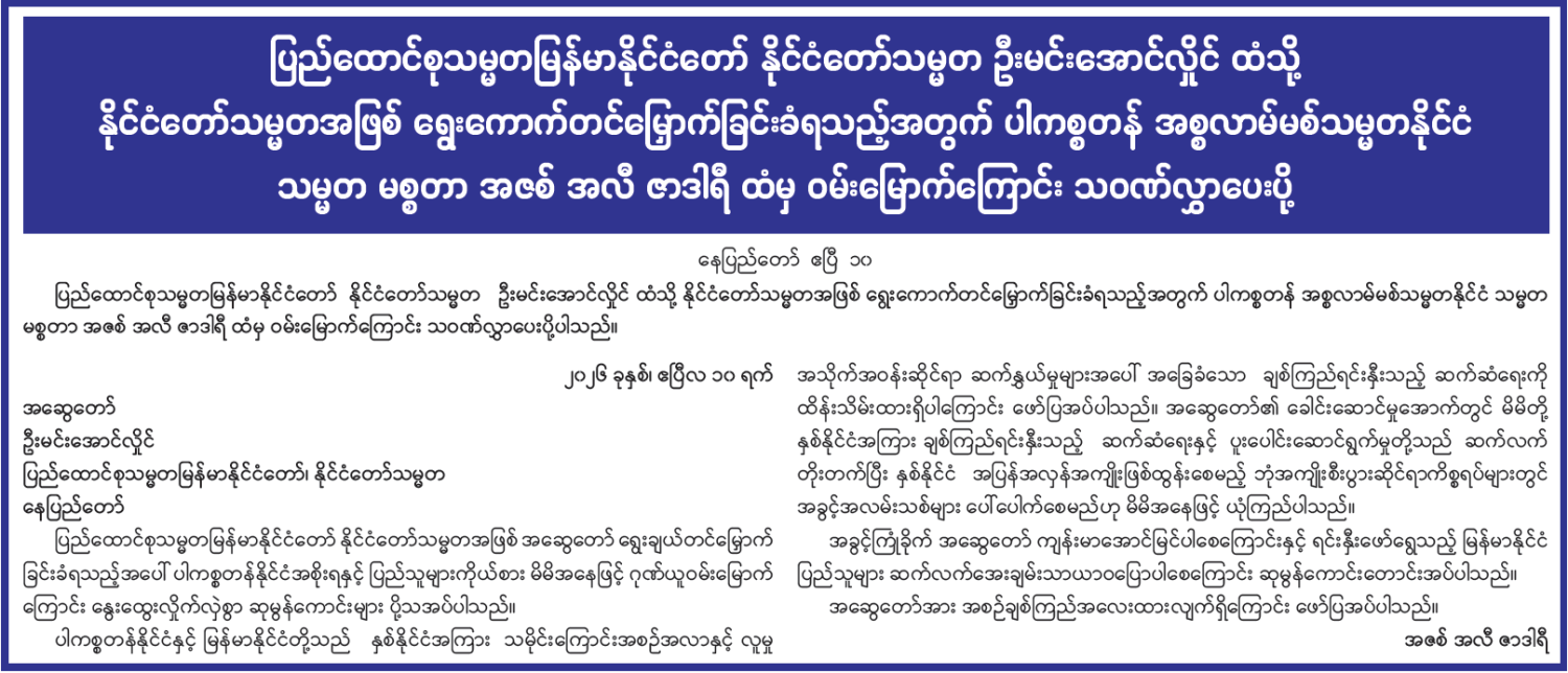 ပြည်ထောင်စုသမ္မတမြန်မာနိုင်ငံတော် နိုင်ငံတော်သမ္မတ ဦးမင်းအောင်လှိုင် ထံသို့ နိုင်ငံတော်သမ္မတအဖြစ် ရွေးကောက်တင်မြှောက်ခြင်းခံရသည့်အတွက် ပါကစ္စတန် အစ္စလာမ်မစ်သမ္မတနိုင်ငံ သမ္မတ မစ္စတာ အဇစ် အလီ ဇာဒါရီ ထံမှ ဝမ်းမြောက်ကြောင်း သဝဏ်လွှာပေးပို့