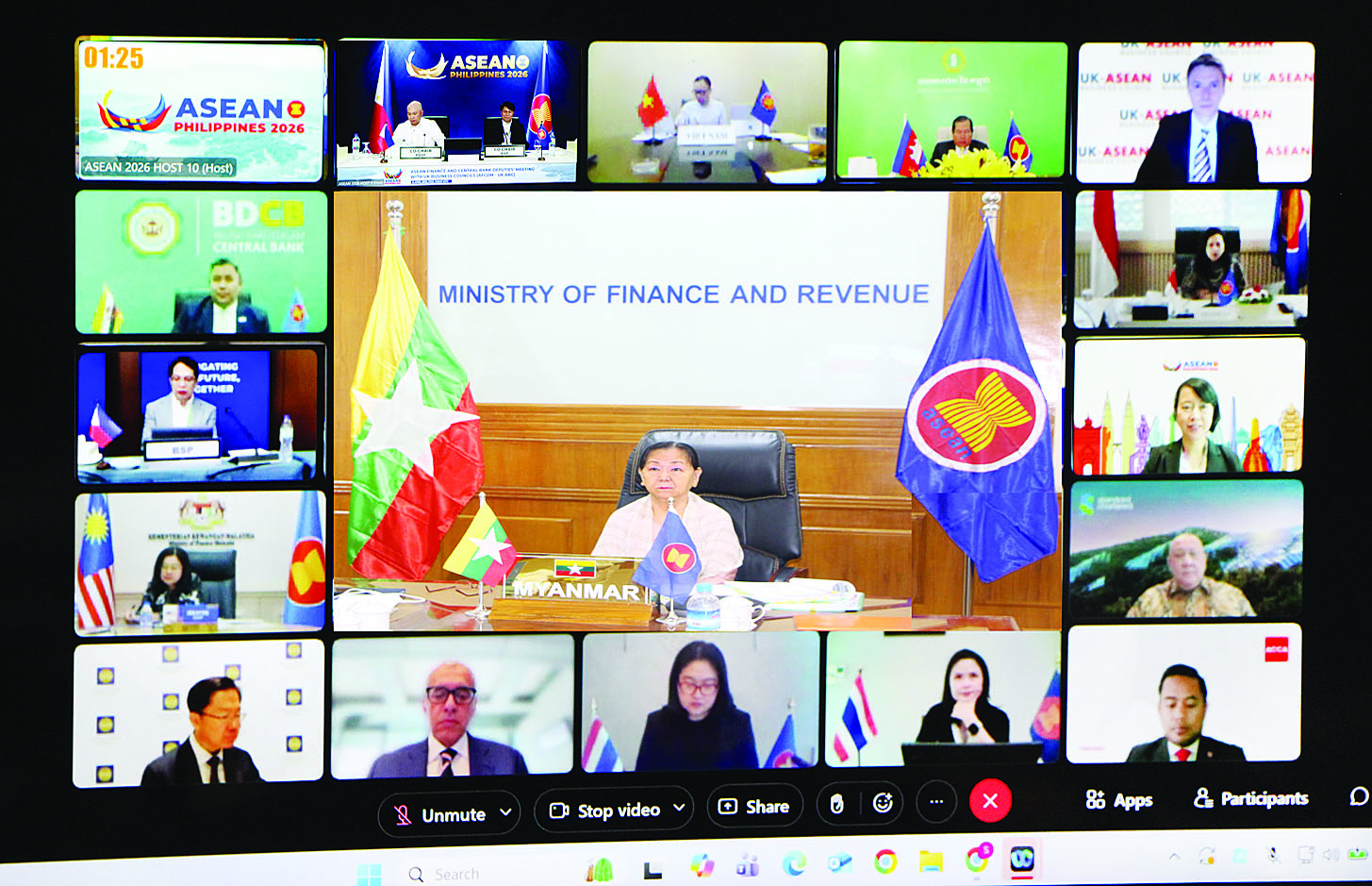 ၂၀၂၆ ခုနှစ်၏ အာဆီယံအလှည့်ကျ သဘာပတိ အဖြစ်ဆောင်ရွက်သည့် ဖိလစ်ပိုင်နိုင်ငံက Virtual အစီအစဉ်ဖြင့် ဧပြီ ၉ ရက်မှ ၁၀ ရက်အထိကျင်းပသည့် (၁၃)ကြိမ်မြောက် အာဆီယံဘဏ္ဍာရေးဝန်ကြီးများနှင့် ဗဟိုဘဏ်ဥက္ကဋ္ဌများ အစည်းအဝေး၊ အကြိမ်(၃၀)မြောက် အာဆီယံဘဏ္ဍာရေးဝန်ကြီးများ အစည်းအဝေးနှင့်ဆက်စပ်အစည်းအဝေးများကို ဘဏ္ဍာရေးနှင့်အခွန်ဝန်ကြီးဌာန ပြည်ထောင်စုဝန်ကြီးကိုယ်စား ဒုတိယဝန်ကြီး ဒေါ်သန်းသန်းလင်း ခေါင်းဆောင်သော ကိုယ်စားလှယ်အဖွဲ့ တက်ရောက်သည်။