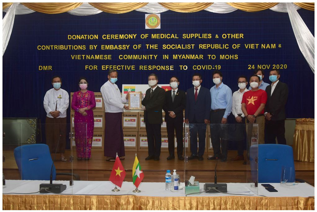 လတ်တလော အသက်ရှူလမ်းကြောင်းဆိုင်ရာ ကိုဗစ်-၁၉ ရောဂါ ကာကွယ်နိုင်ရန်အတွက် ကျန်းမာရေးနှင့် အားကစားဝန်ကြီးဌာနသို့ မြန်မာနိုင်ငံဆိုင်ရာ ဗီယက်နမ်နိုင်ငံသံရုံးနှင့် မြန်မာနိုင်ငံ အခြေစိုက် ဗီယက်နမ်နိုင်ငံ စီးပွားရေးလုပ်ငန်းရှင်များက အမေရိကန်ဒေါ်လာ ၁၅၀၀၀ နှင့်ညီမျှသော Masks (၁၅၉၆၀၀)၊ Thermo meters ၉၀၊ လက်သန့်ဆေးရည် ၄၈၆ ဘူးနှင့် ငွေကျပ် သိန်း ၃၀ဝ ကို လှူဒါန်းခဲ့ခြင်းဖြစ်ကြောင်း သိရသည်။