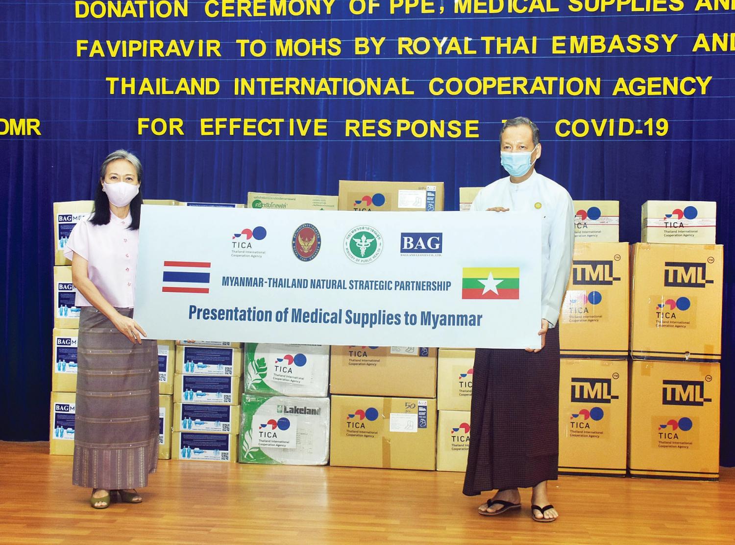 ကျန်းမာရေးနှင့်အားကစားဝန်ကြီးဌာနသို့ ထိုင်းနိုင်ငံသံရုံးနှင့် Thailand International Cooperation Agency တို့က PPE ဝတ်စုံများ၊ ဆေးဘက်ဆိုင်ရာပစ္စည်းများနှင့် FAVIPIRAVIR ဆေးများ ပေးအပ်လှူဒါန်း