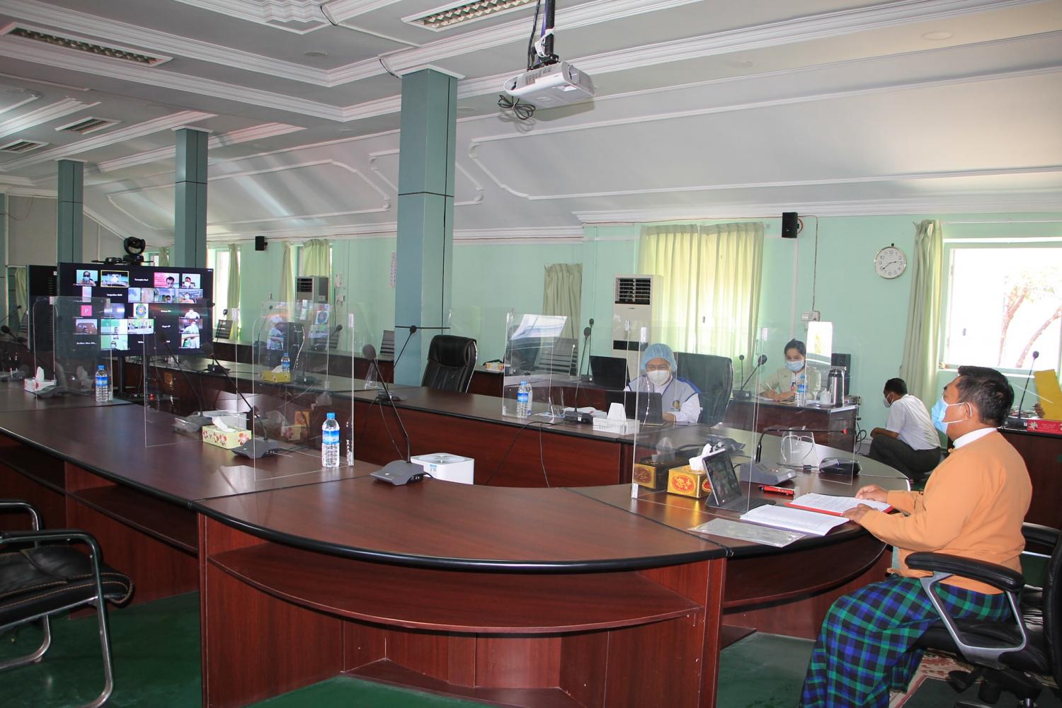 ပဲခူးတိုင်းဒေသကြီးအစိုးရအဖွဲ့ရုံး၊ တော်ဝင်ဟံသာခန်းမ၌ ယမန်နေ့ မွန်းလွဲ ၂ နာရီက ပဲခူးတိုင်းဒေသကြီး ကိုဗစ်-၁၉ ရောဂါ ထိန်းချုပ်ရေးနှင့် အရေးပေါ်တုံ့ပြန်ရေးကော်မတီ လုပ်ငန်းညှိနှိုင်း အစည်းအဝေးအား Online Meeting စနစ်ဖြင့် ကျင်းပပြုလုပ် ခဲ့သည်။