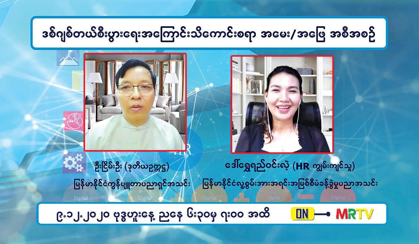ဒီဇင်ဘာ ၉ ရက်(ဗုဒ္ဓဟူးနေ့) ညနေတွင် မြန်မာနိုင်ငံ၏ Digital အသွင် ပြောင်းမှုမှာ ICT အခန်းကဏ္ဍ၏ အရေးပါမှုနှင့် လက်ရှိမြန်မာနိုင်ငံ၏ အလုပ် အကိုင် အခွင့်အလမ်းအခြေအနေ၊ လူ့စွမ်းအားအရင်းအမြစ် အခြေအနေများနှင့် ပတ်သက်ပြီး ဗဟုသုတမျှဝေပေးမည့် ဒစ်ဂျစ်တယ်စီးပွားရေးအကြောင်း သိကောင်းစရာအစီအစဉ်ကို မြန်မာနိုင်ငံ ကွန်ပျူတာပညာရှင်အသင်း ဒုတိယဥက္ကဋ္ဌ ဦးငြိမ်းဦးနှင့် မြန်မာနိုင်ငံ လူ့စွမ်းအားအရင်းအမြစ် စီမံခန့်ခွဲမှုပညာအသင်း (HR ကျွမ်းကျင်သူ) ဒေါ်ရွှေရည်ဝင်းလဲ့တို့က ဆွေးနွေးကြမည်ဖြစ်ရာ ၎င်းဆွေးနွေးချက်များကို ညနေ ၆ နာရီခွဲတွင် ထုတ်လွှင့်သွားမည် ဖြစ်ကြောင်း သိရသည်။
