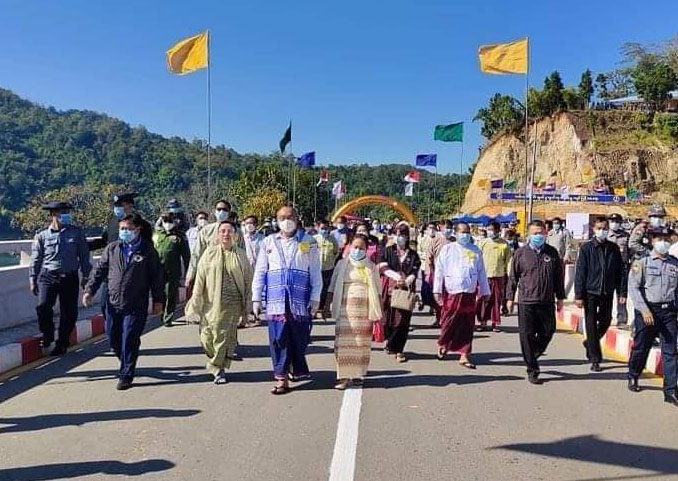 ယင်းနောက် အမျိုးသားလွှတ်တော်ဥက္ကဋ္ဌ မန်းဝင်းခိုင်သန်းနှင့် ကရင်ပြည်နယ်ဝန်ကြီးချုပ် ဒေါ်နန်းခင်ထွေးမြင့် တို့က တံတားကမ္ဗည်းကျောက်စာအား စက်ခလုတ်နှိပ်ဖွင့်လှစ်ပေးသည်။