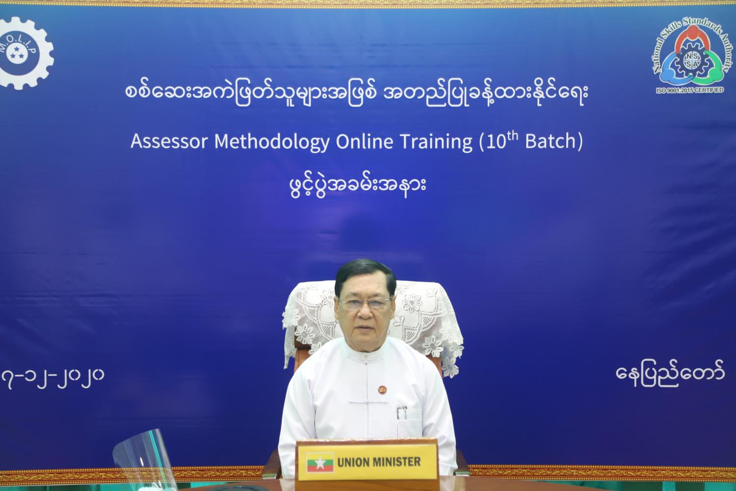 မြန်မာနိုင်ငံ လုပ်သားများ ကျွမ်းကျင်မှု စံသတ်မှတ်ပြဋ္ဌာန်းရေးအဖွဲ့ (NSSA) ၏ စစ်ဆေး အကဲဖြတ်သူများအဖြစ် အတည်ပြု ခန့်ထားနိုင်ရေး Online ဖြင့် ပို့ချသော Assessor Methodology Online Training (10th Batch)ဖွင့်ပွဲအခမ်းအနားကို ယနေ့ နံနက် ၁၀ နာရီတွင် နေပြည်တော်ရှိ အလုပ်သမား၊ လူဝင်မှုကြီးကြပ်ရေးနှင့် ပြည်သူ့အင်အား ဝန်ကြီးဌာန အစည်း အဝေးခန်းမ၌ ဗီဒီယို ကွန်ဖရင့်စနစ်ဖြင့် ကျင်းပသည်။