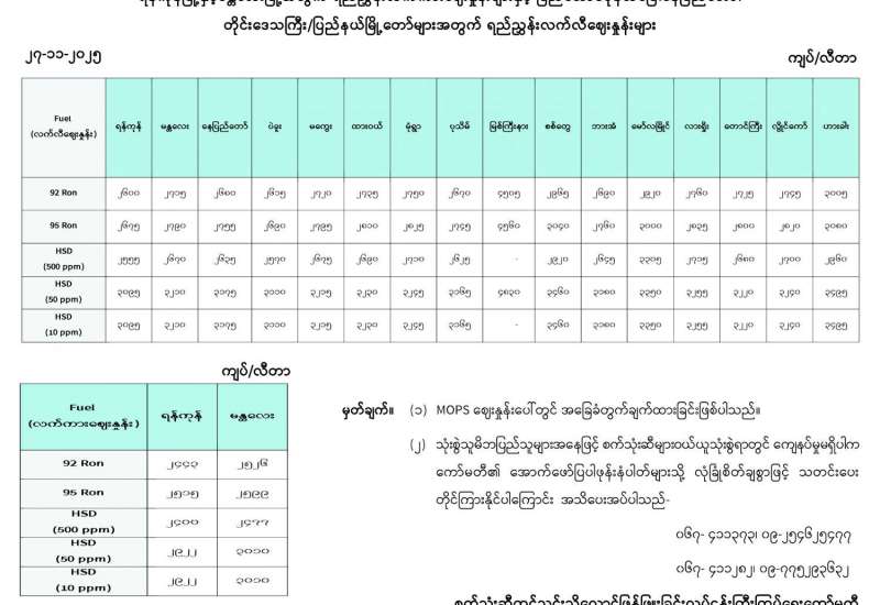 ရန်ကုန်မြို့နှင့် မန္တလေးမြို့အတွက် ရည်ညွှန်းလက်ကားဈေးနှုန်းများနှင့် ပြည်ထောင်စုနယ်မြေ နေပြည်တော်၊ တိုင်းဒေသကြီး/ပြည်နယ် မြို့တော်များအတွက် ရည်ညွှန်းလက်လီဈေးနှုန်းများ