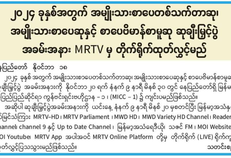 ၂၀၂၄ ခုနှစ်အတွက် အမျိုးသားစာပေတစ်သက်တာဆု၊ အမျိုးသားစာပေဆုနှင့် စာပေဗိမာန်စာမူဆု ဆုချီးမြှင့်ပွဲ အခမ်းအနား MRTV မှ တိုက်ရိုက်ထုတ်လွှင့်မည်
