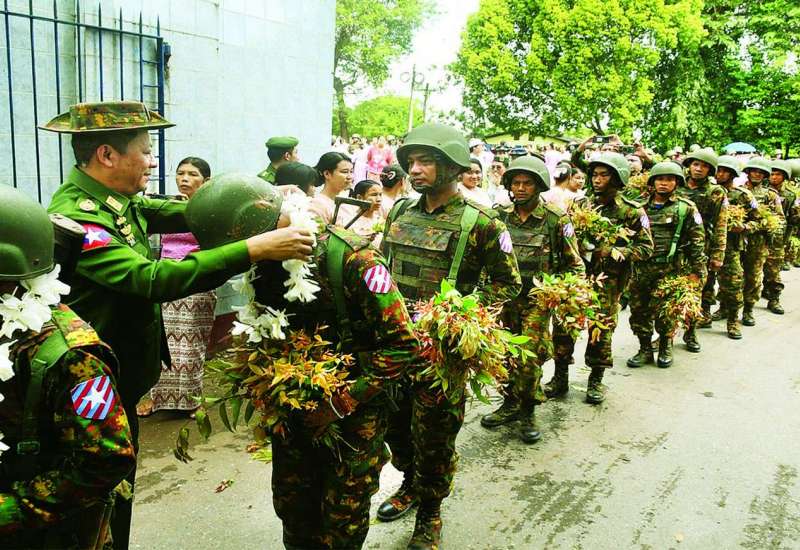 ရှေ့တန်းစစ်မျက်နှာများတွင် ရွပ်ရွပ်ချွံချွံ တိုက်ပွဲဝင်ပြီး အောင်ပွဲအလီလီရယူနိုင်ခဲ့သော အောင်ပွဲရရှေ့တန်းပြန် တပ်မတော်သားများအား ဂုဏ်ပြုကြိုဆိုခြင်းကို ယနေ့နံနက်ပိုင်းတွင် နယ်မြေခံတပ်၌ ကျင်းပပြုလုပ်ရာ ကာကွယ်ရေးဦးစီးချုပ်ရုံး (ကြည်း) မှ ဒုတိယဗိုလ်ချုပ်ကြီး ညွန့်ဝင်းဆွေ၊ ကရင်ပြည်နယ်ဝန်ကြီးချုပ် ဦးစောမြင့်ဦးနှင့် ဌာနဆိုင်ရာတာဝန်ရှိသူများ၊ ဒေသခံတိုင်းရင်းသားပြည်သူများ၊ ဆရာ ဆရာမများ၊ ကျောင်းသား ကျောင်းသူများ၊ တိုင်းရင်းသားရိုးရာယဉ်ကျေးမှုအဖွဲ့များနှင့် အရာရှိ၊ စစ်သည်၊ မိသားစုဝင်များက အောင်သပြေခက်ကမ်း၍ ပန်းကုံးစွပ်ပြီး အိုးစည် ဒိုးပတ်၊ အတီးအမှုတ်အကအခုန်များဖြင့် သောင်းသောင်းဖြဖြဂုဏ်ပြုကြိုဆိုခဲ့ကြသည်။
