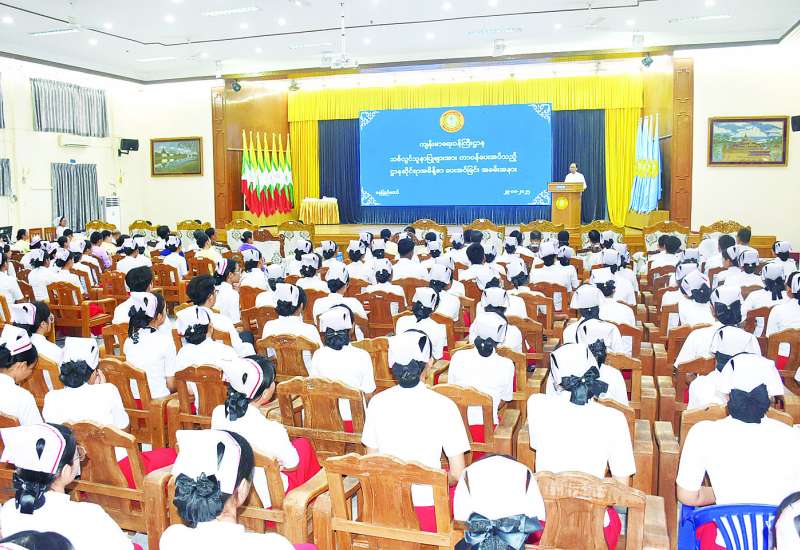 ကျန်းမာရေးဝန်ကြီးဌာနမှ သူနာပြုသိပ္ပံဘွဲ့(ပုံမှန်)အောင်မြင်သော သစ်လွင်သူနာပြုများ တာဝန်ပေးအပ်သည့် ဌာနဆိုင်ရာအမိန့်စာပေးအပ်ခြင်းကို ယနေ့ နံနက် ၉ နာရီတွင် ကျန်းမာရေး ဝန်ကြီးဌာန ရုံးအမှတ်(၄) နေပြည် တော်၌ ကျင်းပသည်။