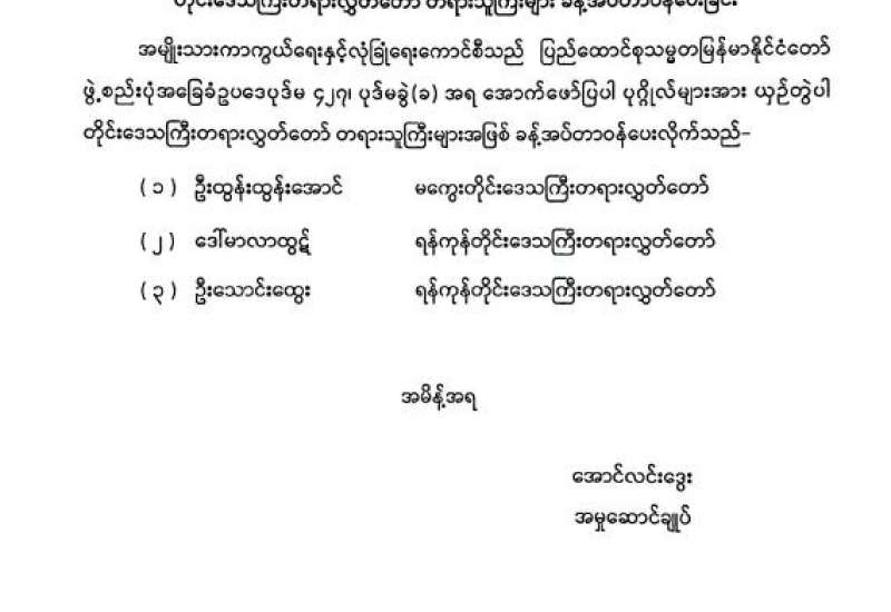 တိုင်းဒေသကြီးတရားလွှတ်တော် တရားသူကြီးများခန့်အပ်တာဝန်ပေးအပ်ခြင်း